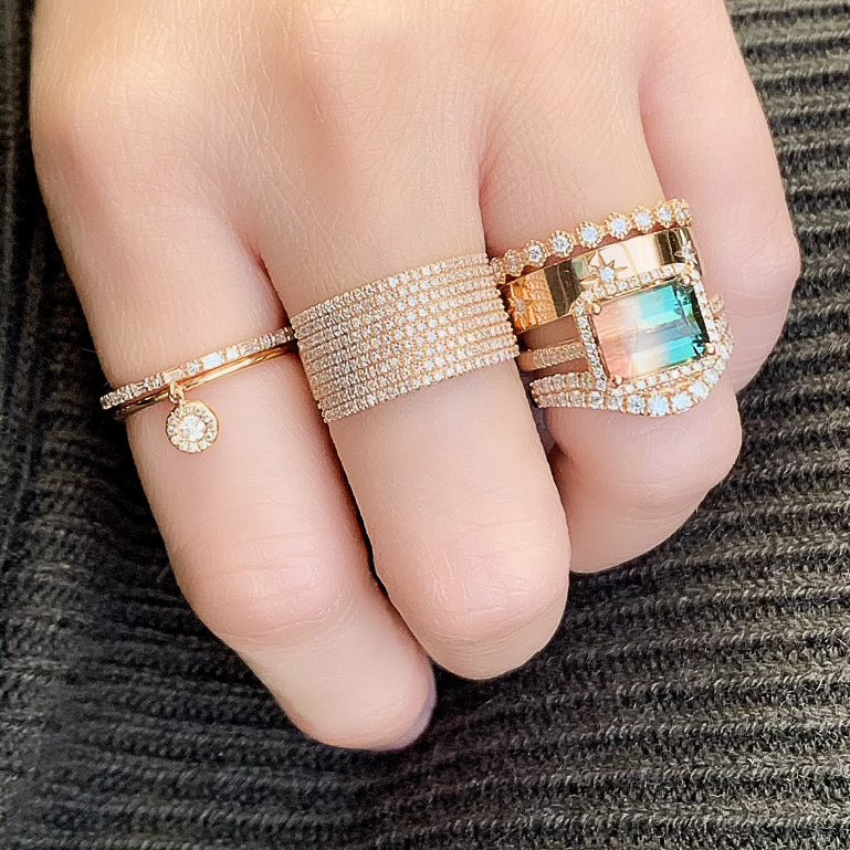 This truly breathtaking one of a kind tourmaline is set on a solid 14k rose gold ring, adorned with diamonds. The centerpiece is a one of a kind natural tourmaline, with pink and green. The natural features of this stone are accentuated by its emerald cut, offering a clear view into the stone's depths and showcasing its texture.