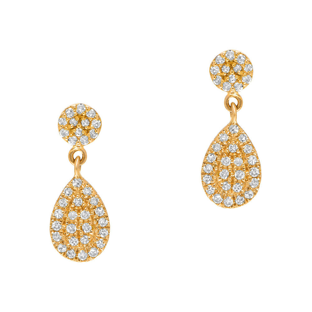 14K gold pave disc earrings, with dangling pave pear shapes to add movement and shine. This petite style is a fun everyday earring when you want a little bit of style and sparkle!