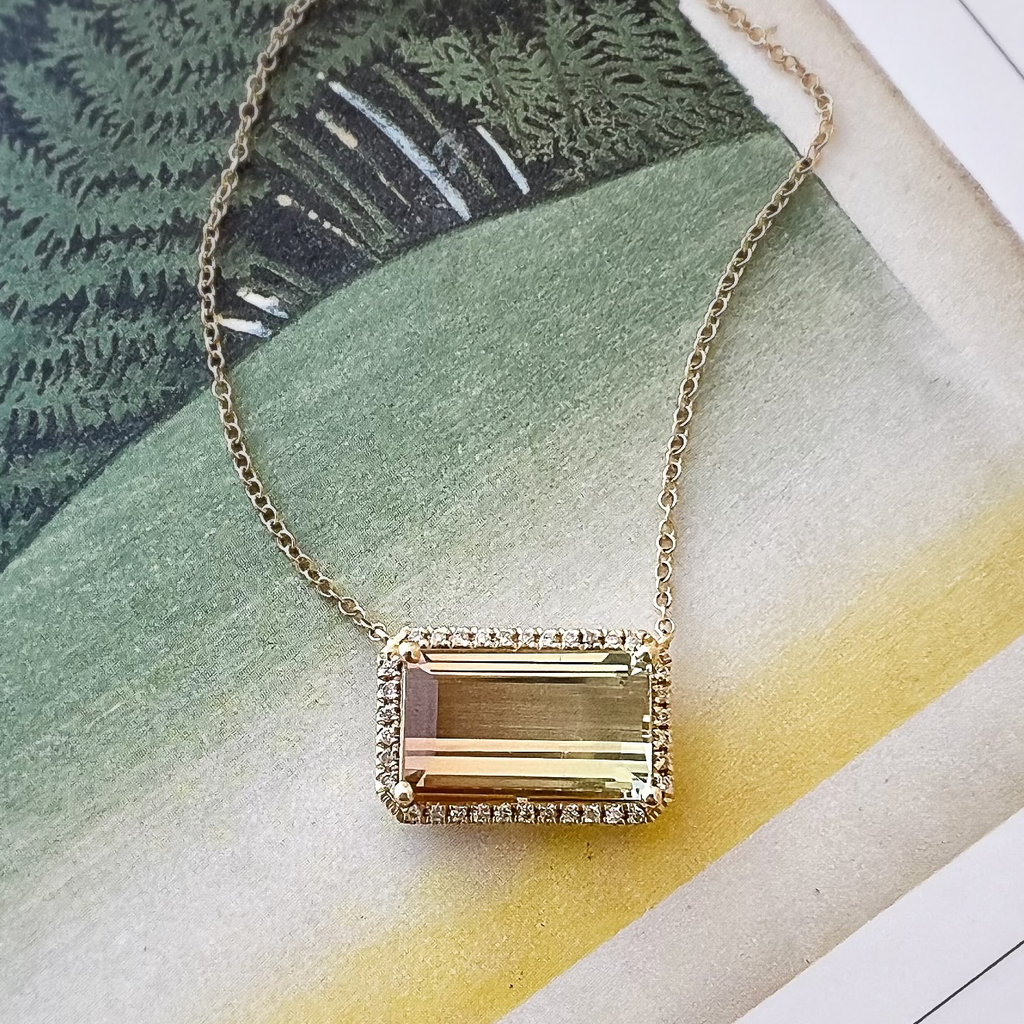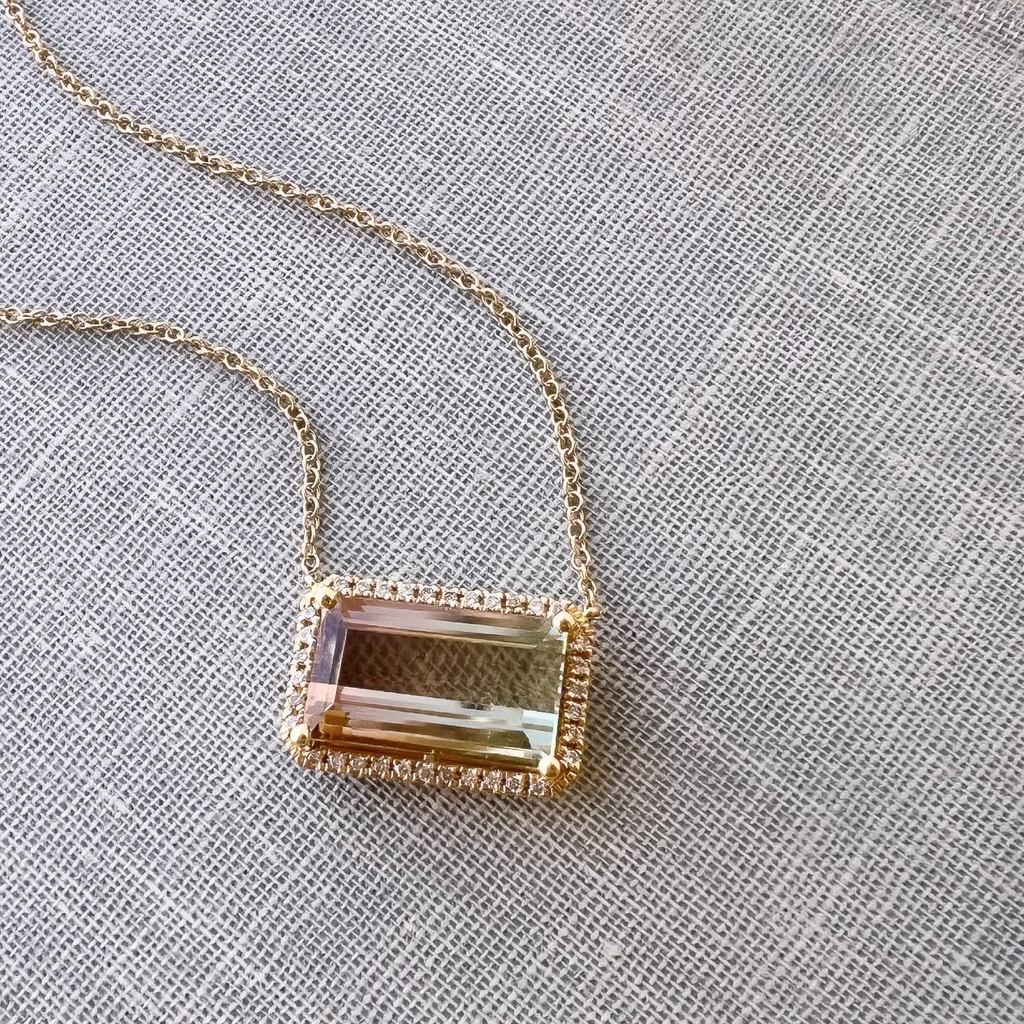 This spectaular necklace features a one of a kind hand-selected tourmaline, set in solid 14k yellow gold, haloed with all-natural diamonds and hung from a 16-18" adjustable chain. A necklace as unique as you are, this stunner can be layered or worn on its own.