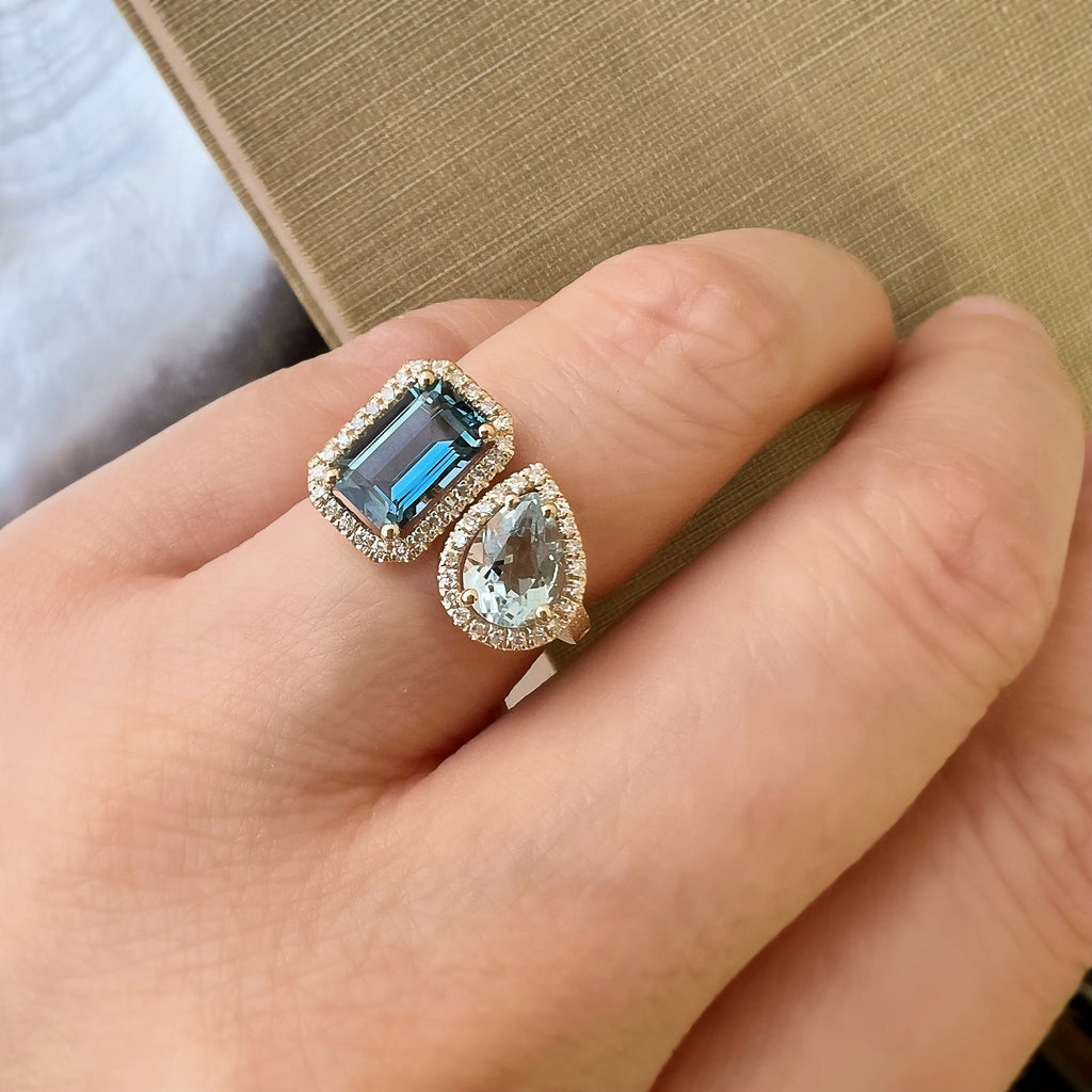 Dip into tranquil blues with this beautiful Toi et Moi Ring. This gorgeous piece features a hand-selected pear shape sky blue topaz and emerald cut London blue topaz, cut in-house, and nestled into a custom-made setting of solid 14k gold with natural, conflict-free diamonds.