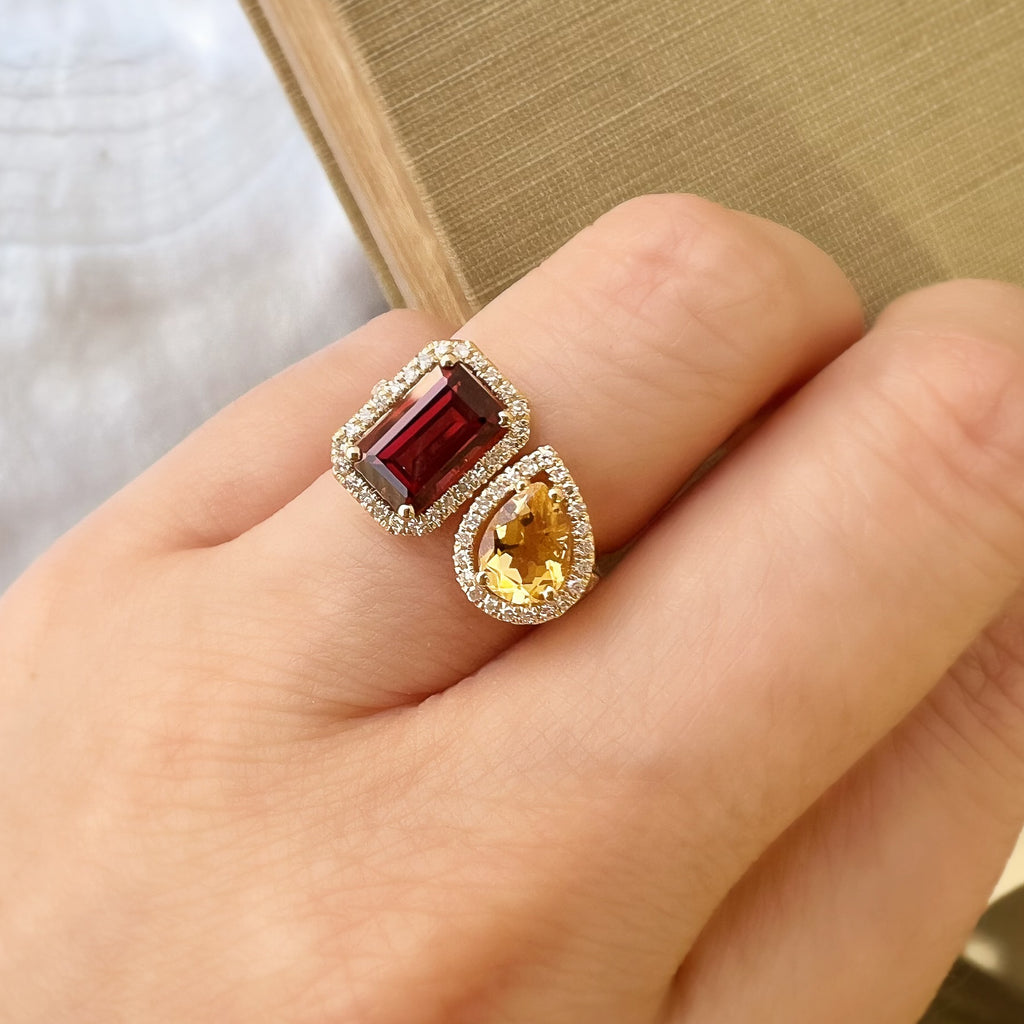 Bring light to life with this beautiful Toi et Moi Ring. This gorgeous piece features a hand-selected pear shape citrine and emerald cut garnet, cut in-house, and nestled into a custom-made setting of solid 14k gold with natural, conflict-free diamonds.