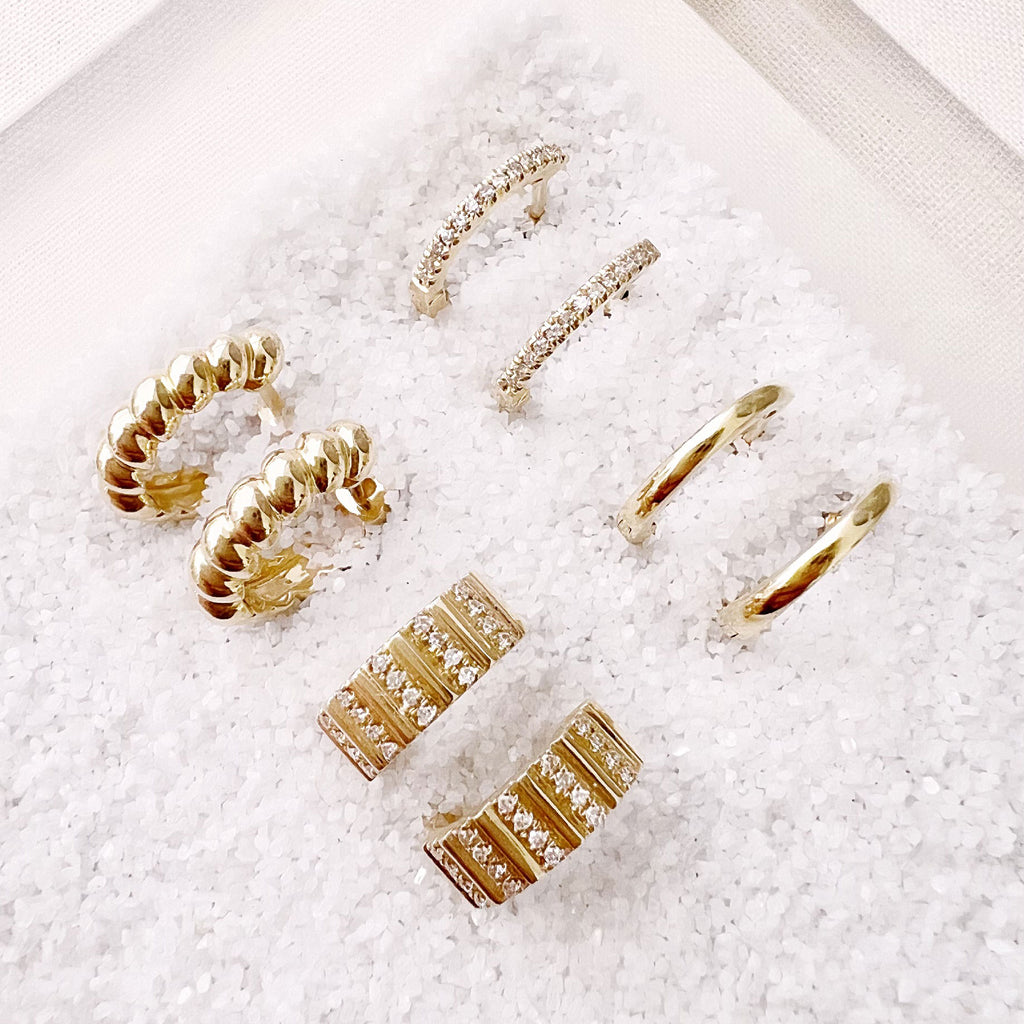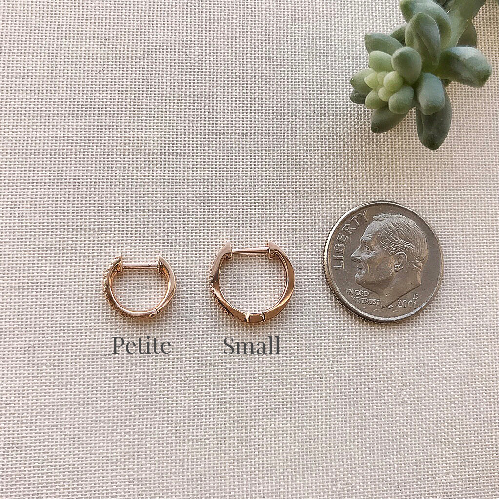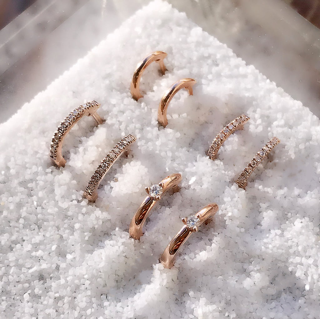 Looking for something a little simpler? Try our High Polish Huggies. For second and third holes, try our Petite Diamond Huggies or Petite High Polish Huggies. Or for something a little bigger, try our 12mm Huggies in diamond or high polish finish, or our 15mm Huggies in diamond or high polish finish. Looking for some guidance? Click here to read our comprehensive guide to find the right huggies for you.