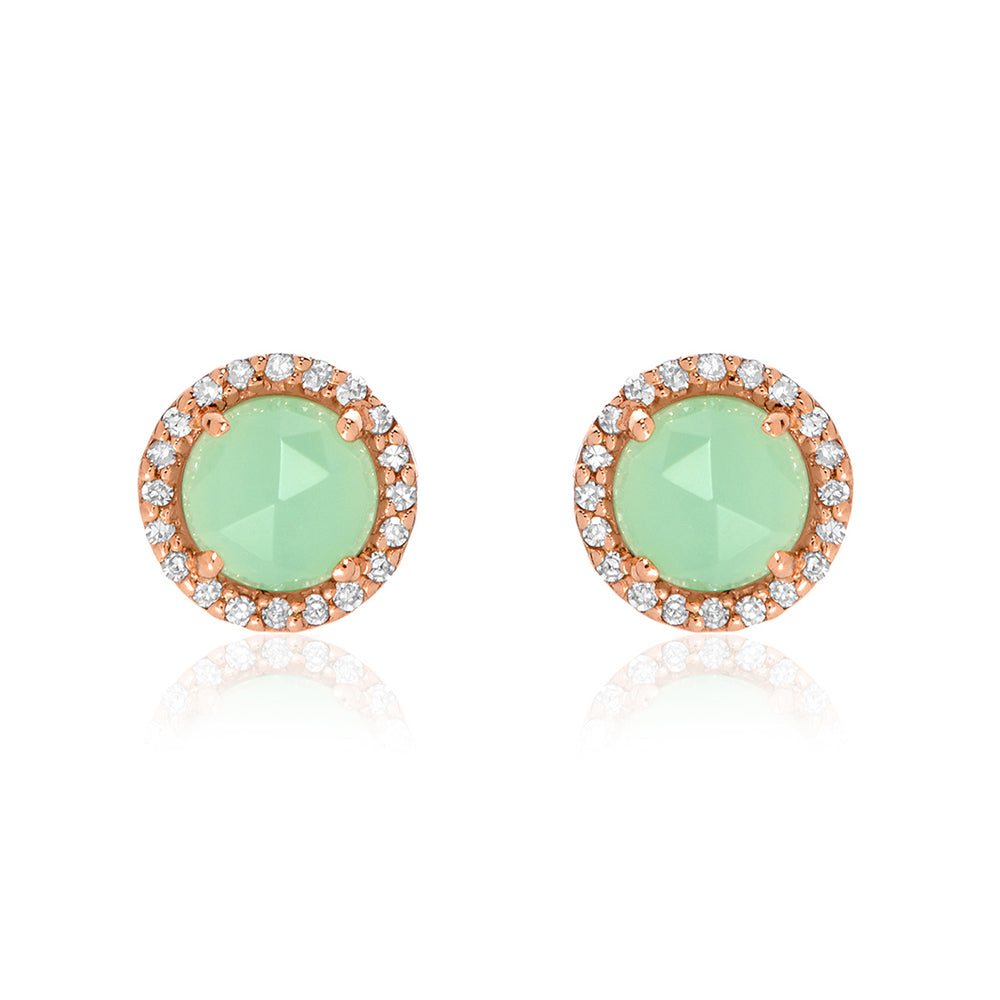 5.0mm stud earrings in 14k gold with a rose cut chrysoprase center and a halo of diamonds on each stud.