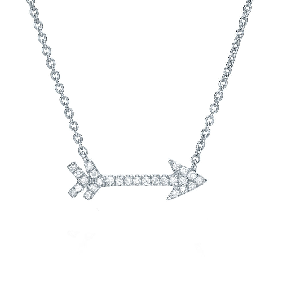 This super cute arrow necklace is set in 14k rose, white or yellow gold and features 26 micropave hand set, responsibly sourced diamonds. This necklace hangs on a 16-18" adjustable chain.