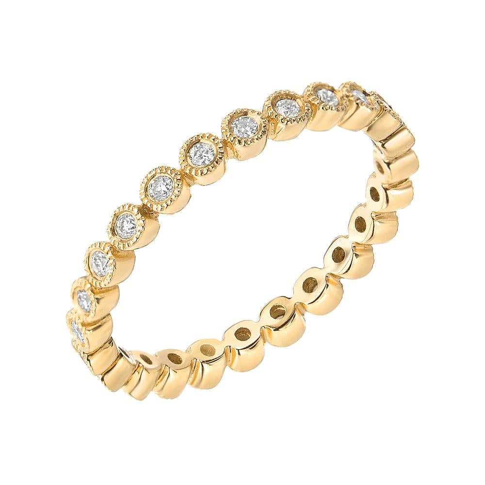 This 14k gold ring features bezel set diamonds all the way around the ring. Perfect for stacking, or wearing alone.