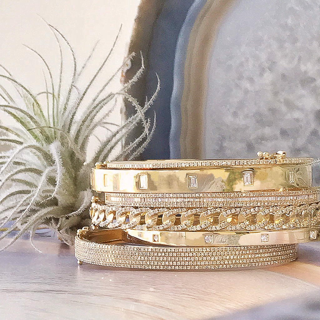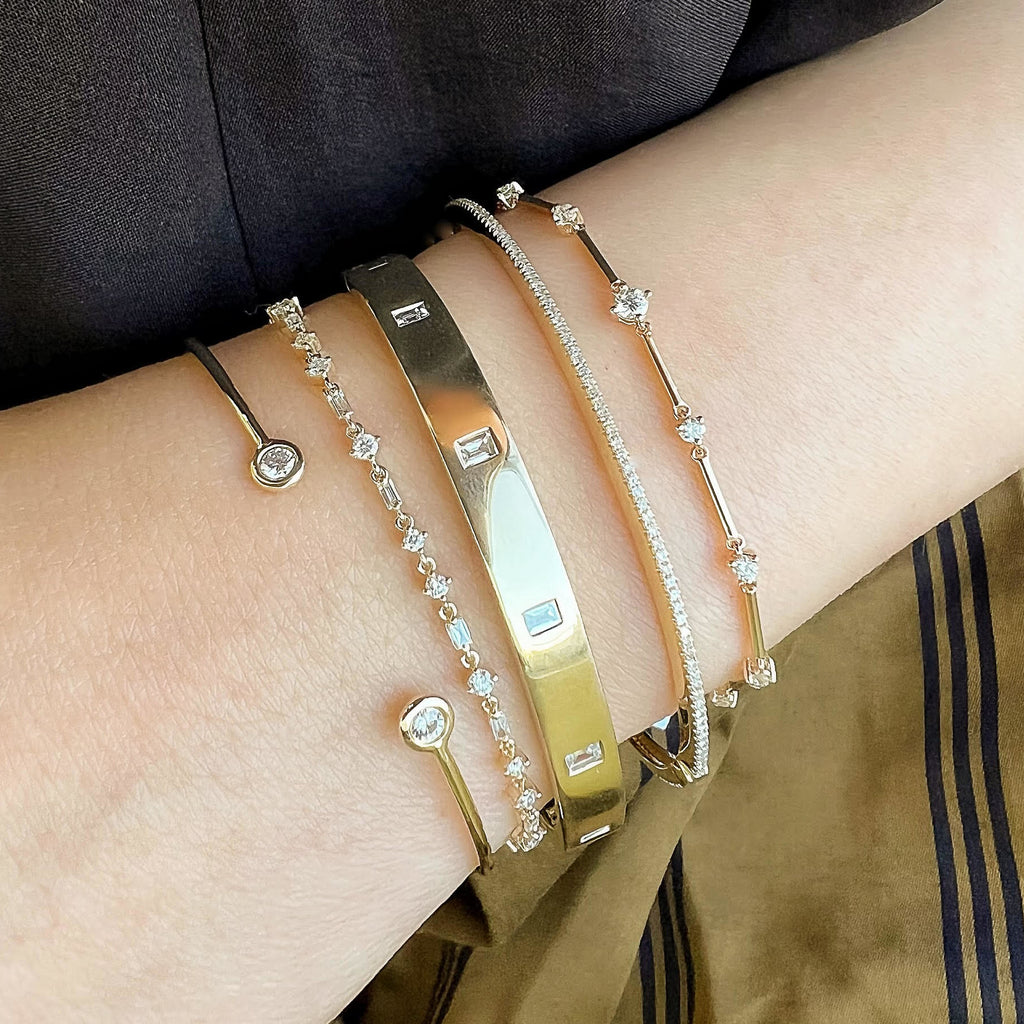 A classic! This beautiful solid 14k gold bracelet is studded with natural baguette diamonds all the way around. Use it as the focal point point to an amazing stack of bracelets. This bangle comes as standard in a 6.5" size - other sizes are available to order.