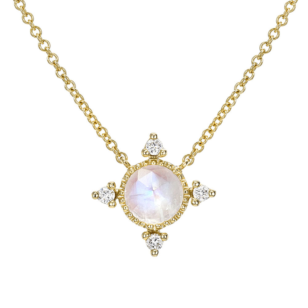 We’re thrilled to present an array of ethically-sourced, handcrafted diamond and gold jewelry with hand-selected colored stones. All of our diamonds are conflict free, and we use only the highest quality metals and techniques. This Compass Points necklace is a stand-out in our collection, and makes the perfect addition to your jewelry collection –– or a gorgeous gift for someone special. For questions about this rainbow moonstone and diamond necklace, we invite you to contact us at (213) 293-6088, or reach us anytime via email at info@livenco.com.