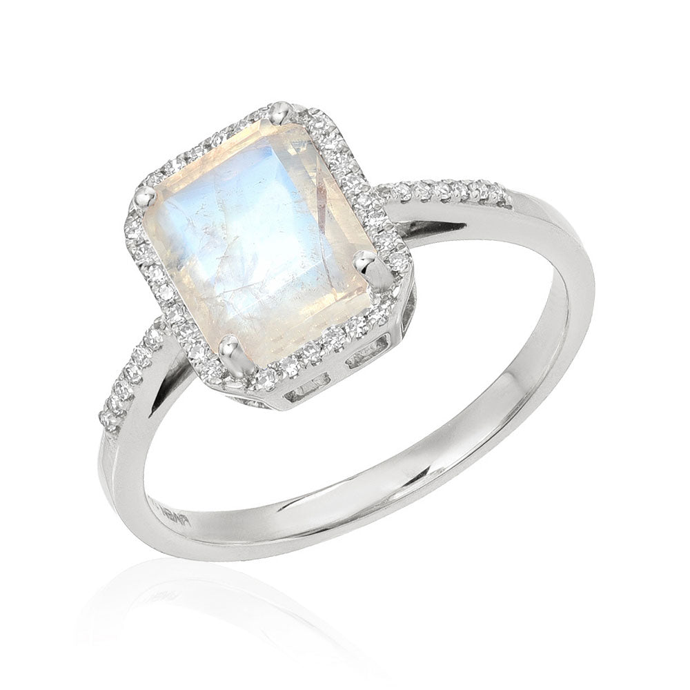 This dreamy ring features an emerald cut all-natural rainbow moonstone center - the stone of balance and harmony - haloed with diamonds and set on a diamond studded band.