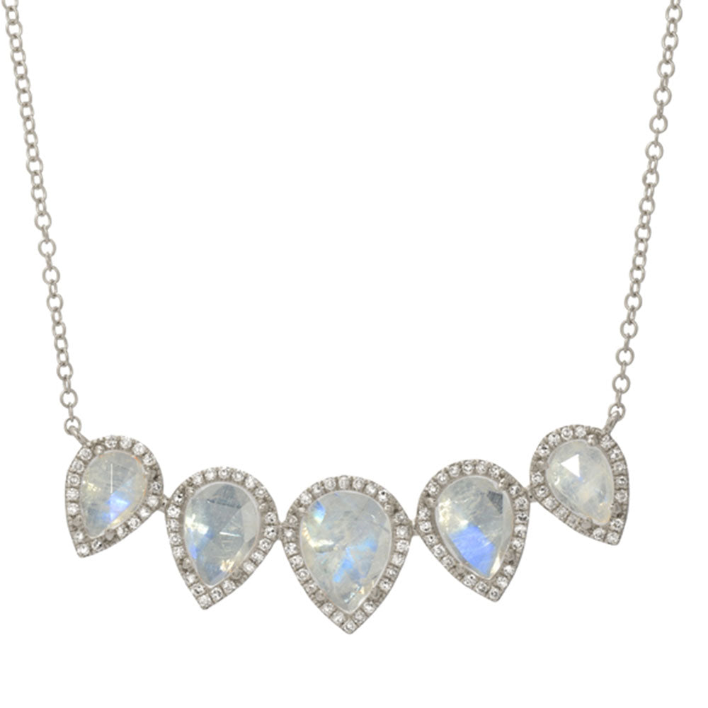 This gorgeous necklace showcases pretty rose cut rainbow moonstones with diamond halos on a 16-18" adjustable chain.