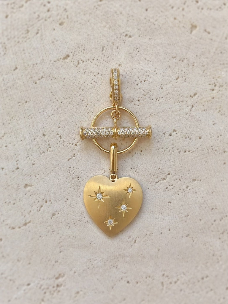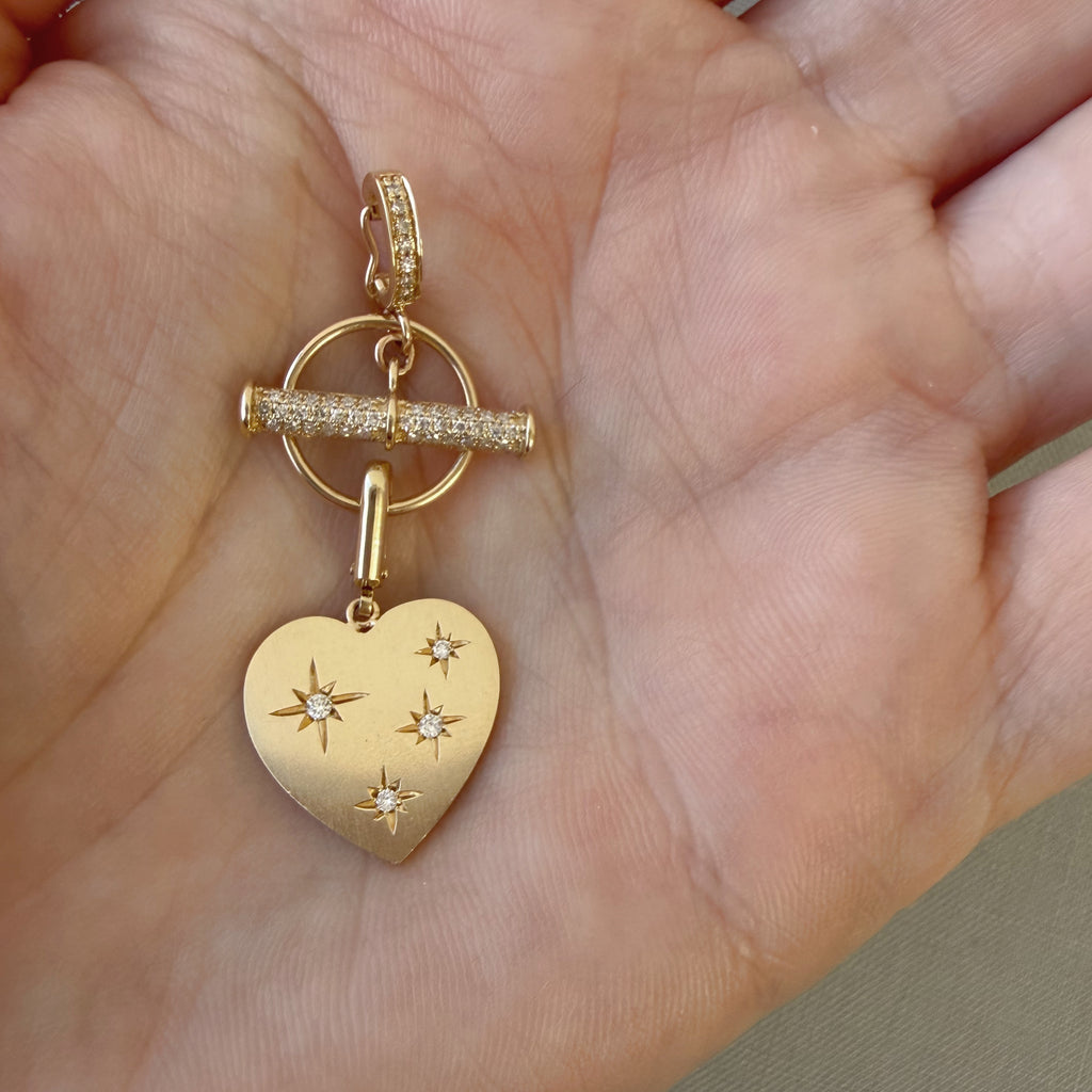 This Anniversary set pairs the Heart of Gold with our Foundation Toggle T-Bar — a signature base designed to be worn alone or built upon over time. The T-Bar features a diamond enhancer, allowing it to clip or glide onto a variety of chains, while the charm ring offers the freedom to add or remove pieces as your collection evolves.