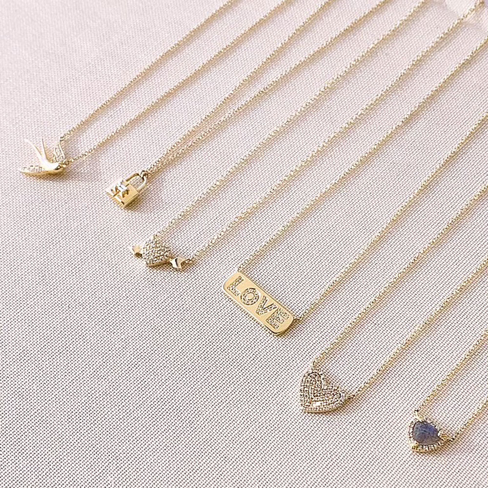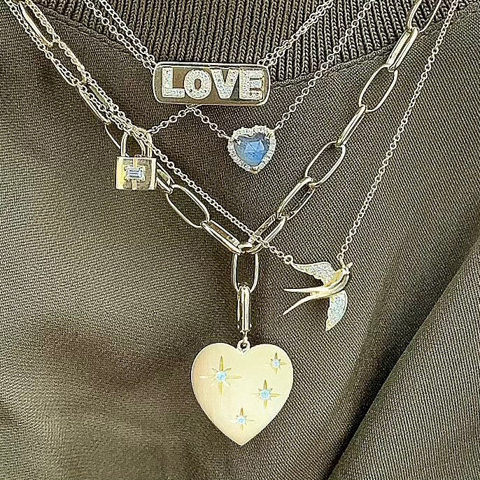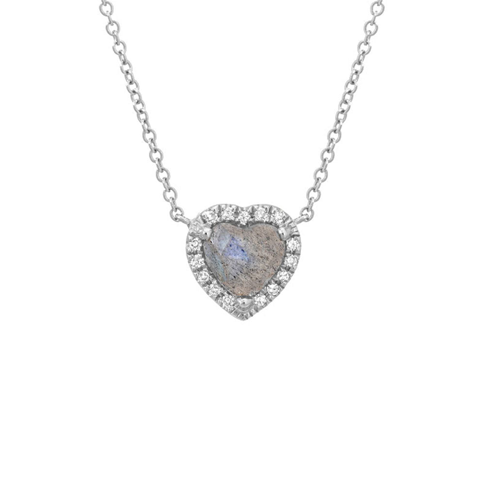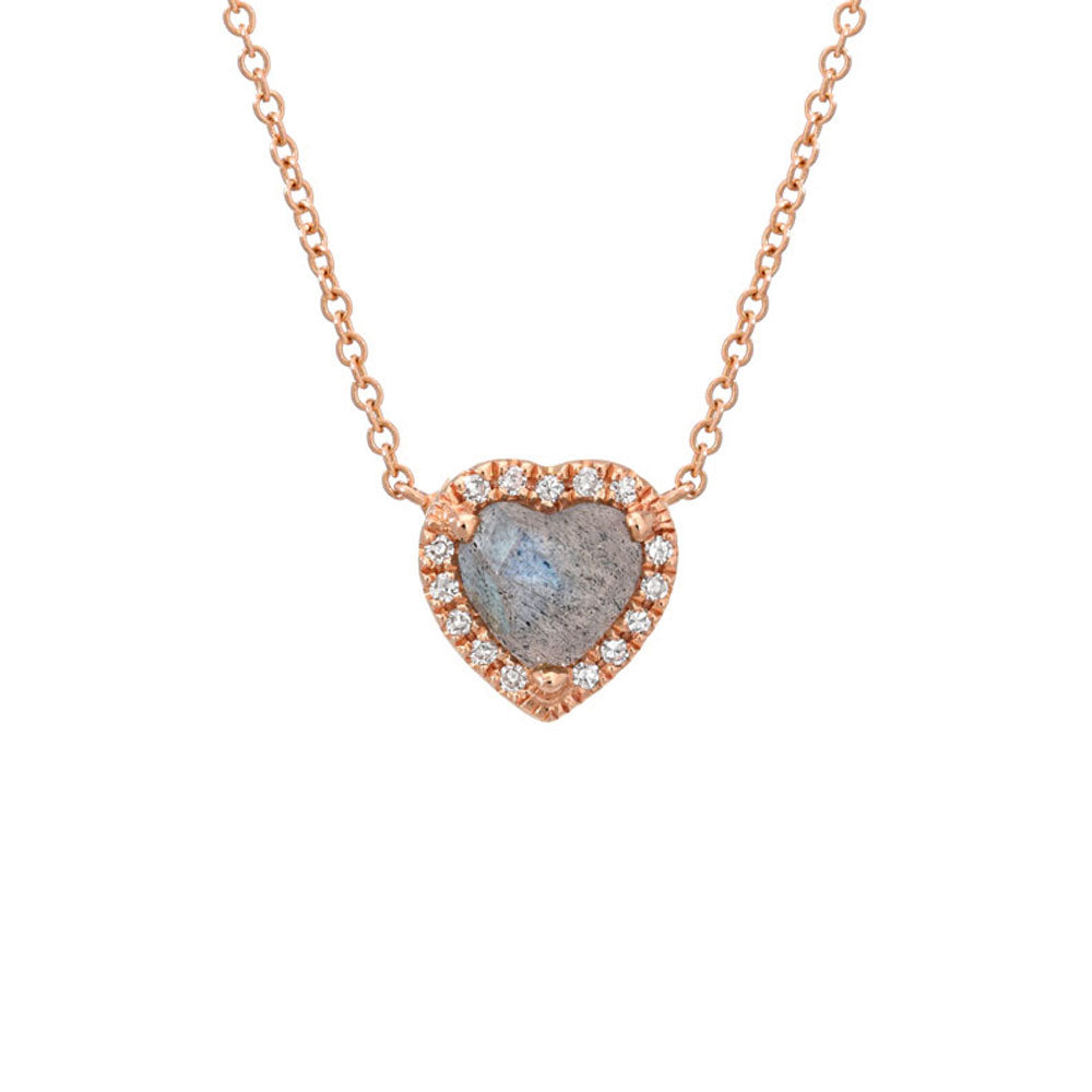 In 14k rose, yellow or white gold, this beautiful heart-shaped cut labradorite is haloed with diamonds. A gorgeous love token. Some gold colors may require a special order, and as we use all-natural stones in this necklace, your beautiful labradorite center may look different to the one in the featured images.