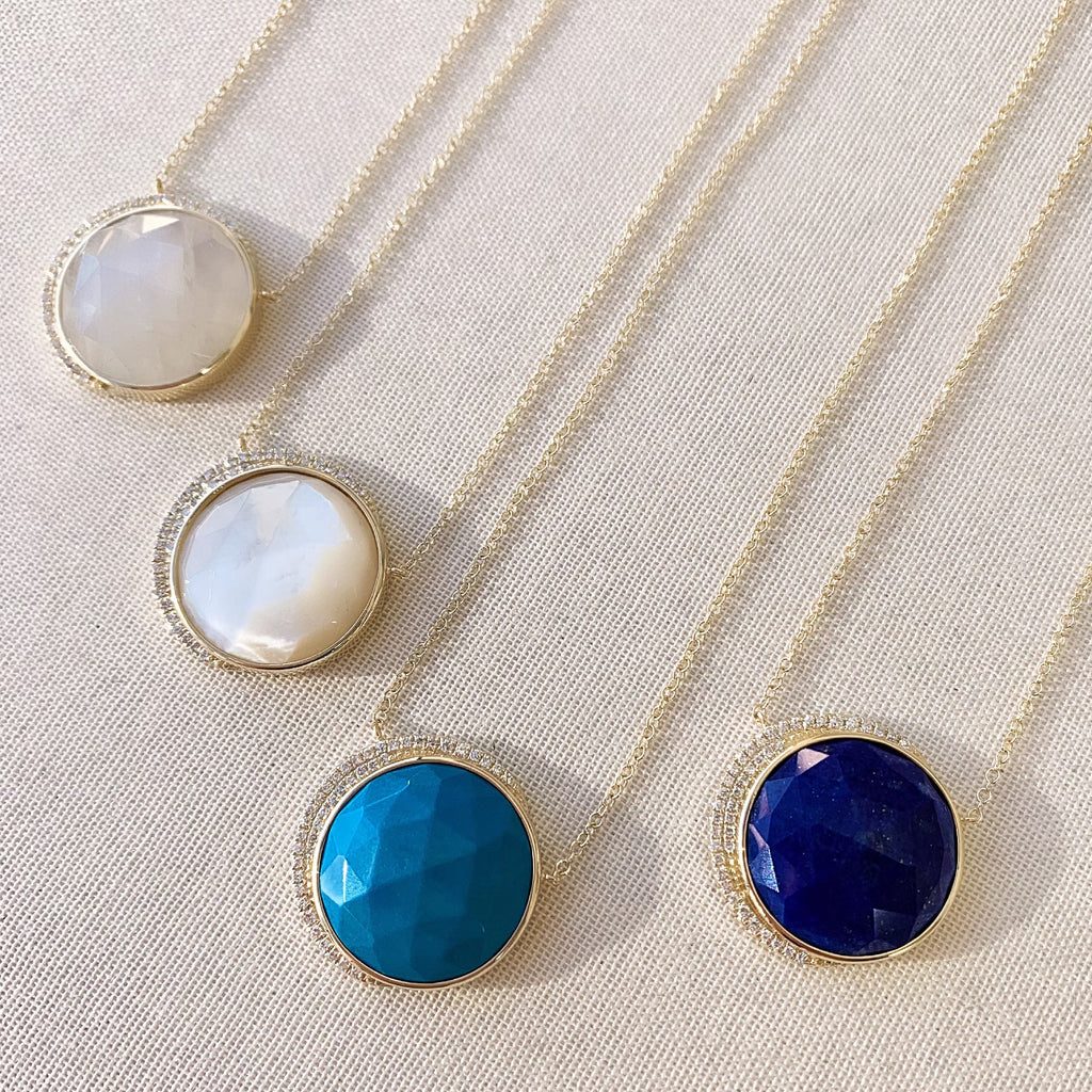 Be bold and unique with this stunning larger size moon phase necklace. Featuring a truly breathtaking 16mm diameter center stone, cut in-house from all-natural materials, and nestled into a custom-made gold setting with natural, conflict-free diamonds, this gorgeous necklace is sure to become the centerpiece of your jewelry collection.