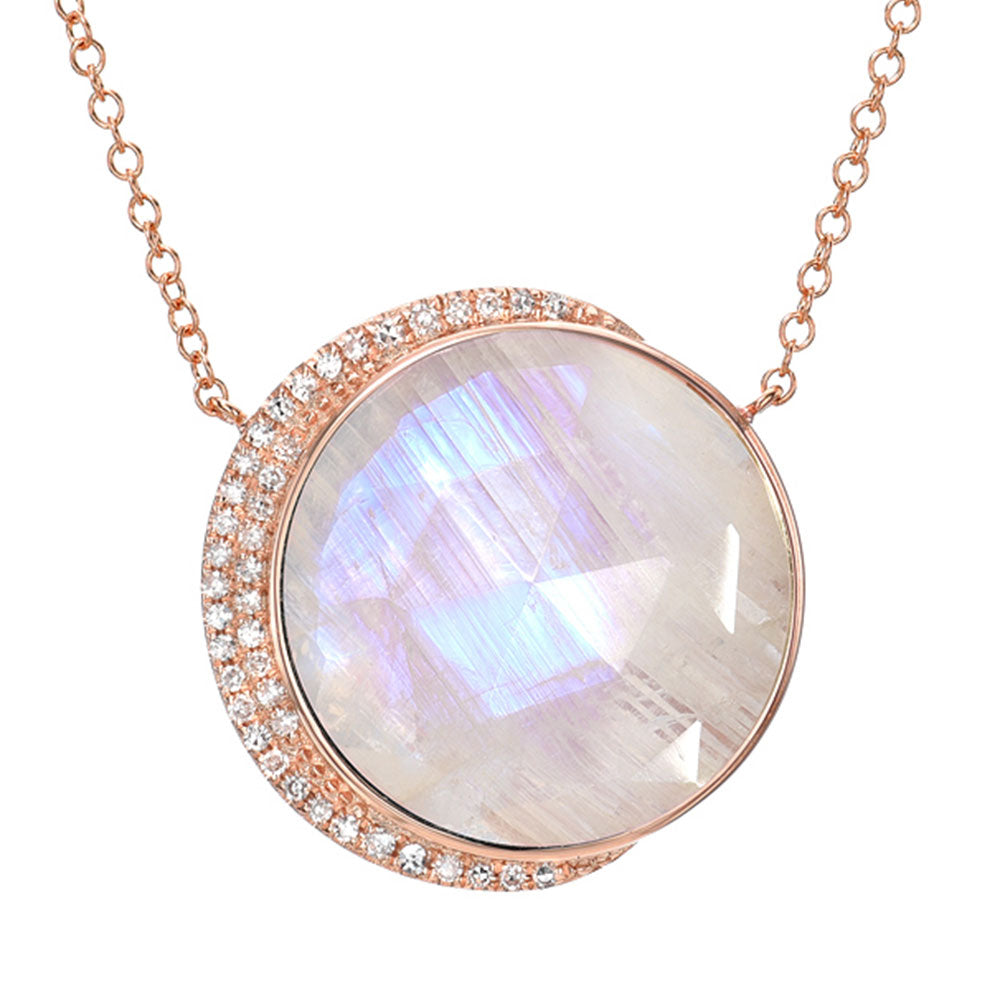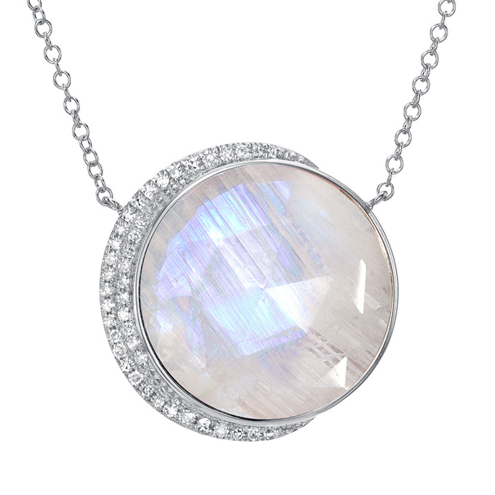 This rainbow moonstone and diamond necklace showcases a perfect combination of expert detailing and lustrous design. Here are a few of our favorite features of the moon phase rainbow moonstone necklace: