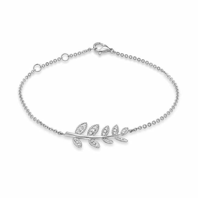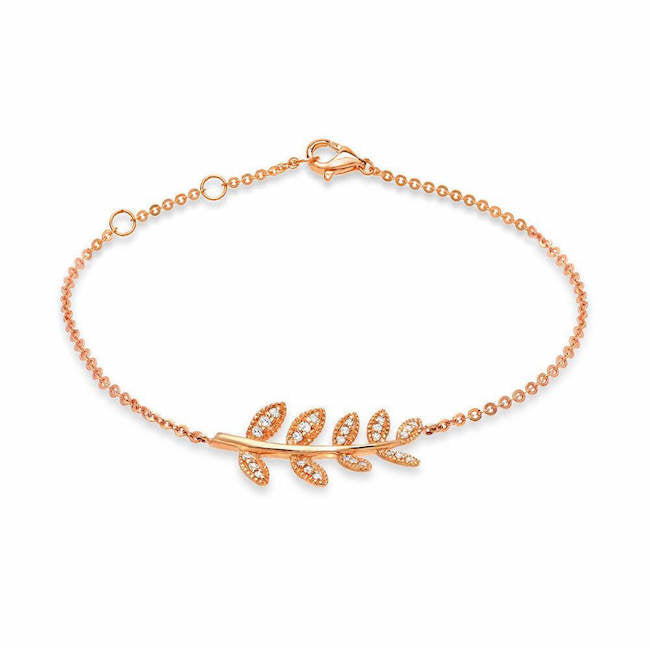 14k gold bracelet featuring a curved branch with diamond studded leaves. This bracelet is adjustable to a 6.0-6.5-7.0" length. Leaves symbolize growth and renewal, so this is a powerful piece to add to your wrist stack.