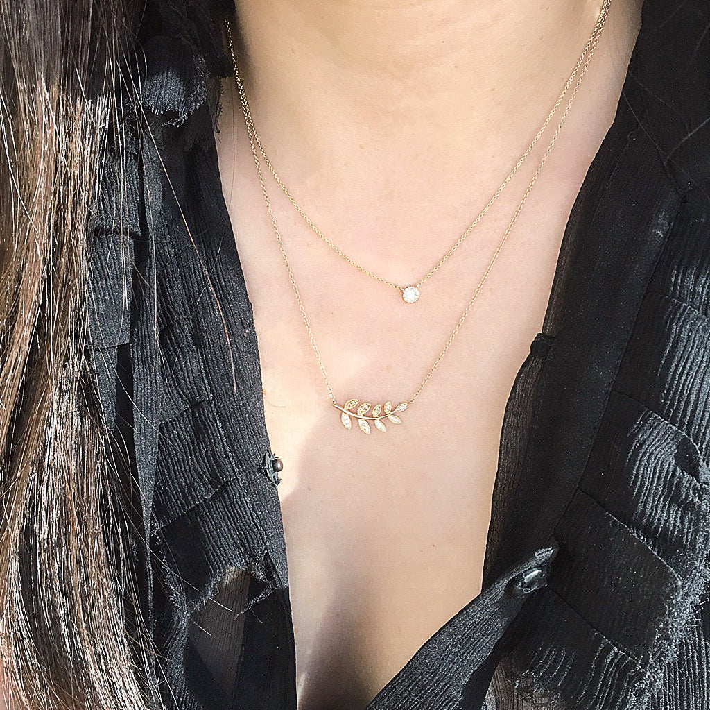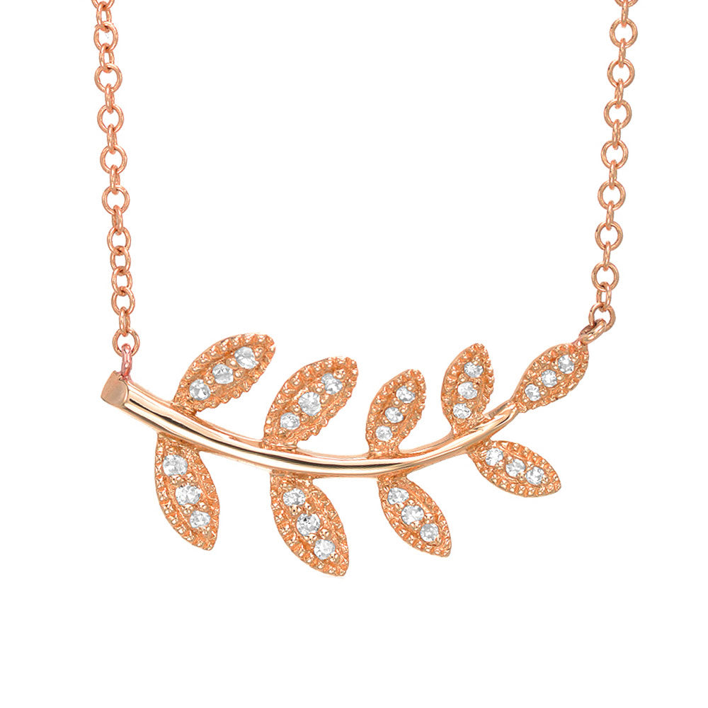 Beautifully crafted, this lovely necklace features diamond studded leaves on a curved branch set in 14k gold and attached to a 16-18” adjustable chain.