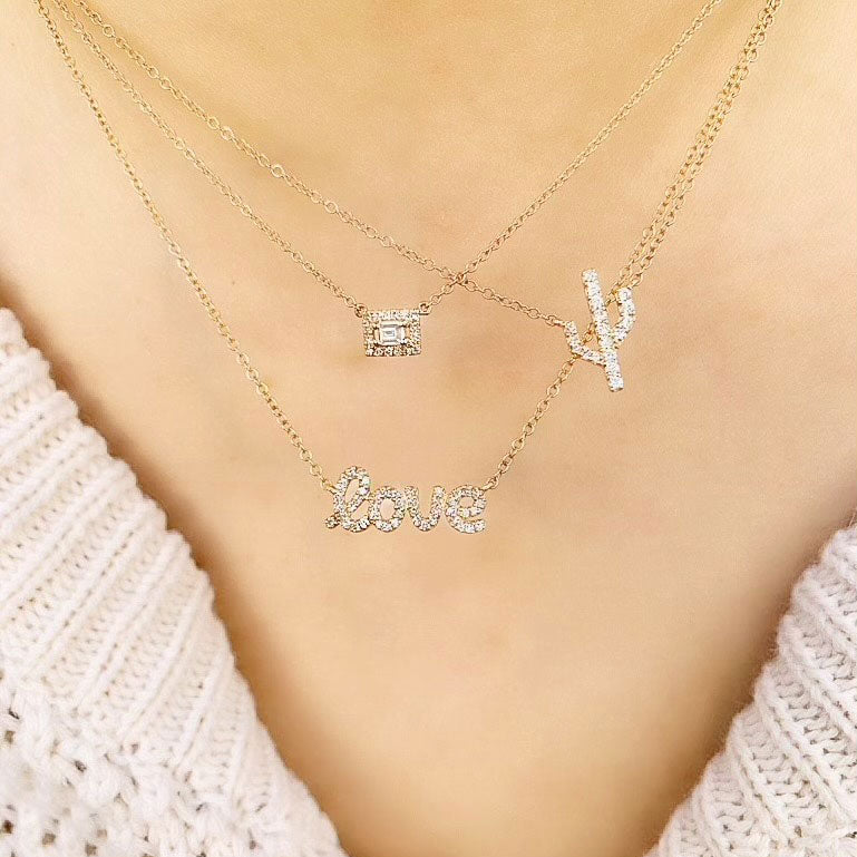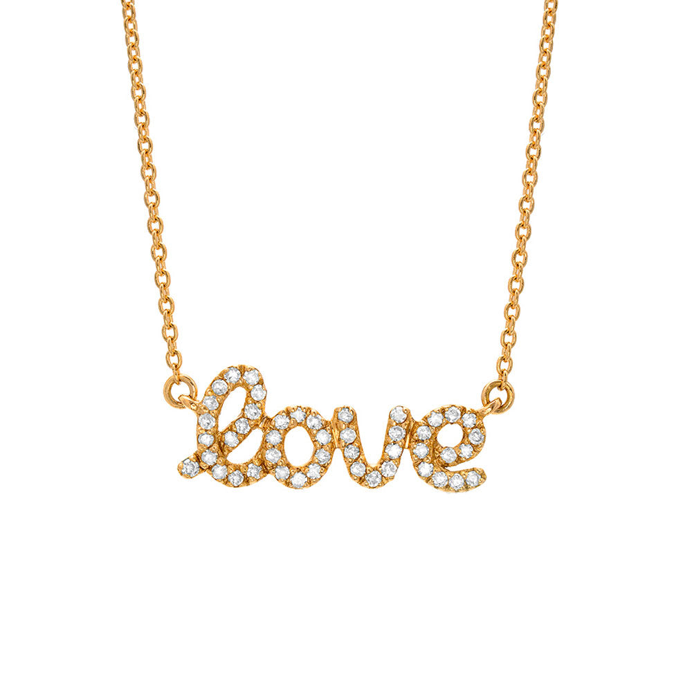 This diamond studded love script necklace is set in 14k gold, available in romantic rose, classic yellow or modern white, and is attached to a 16-18" adjustable chain. Layer this with our heart necklace for a romantic neckline.