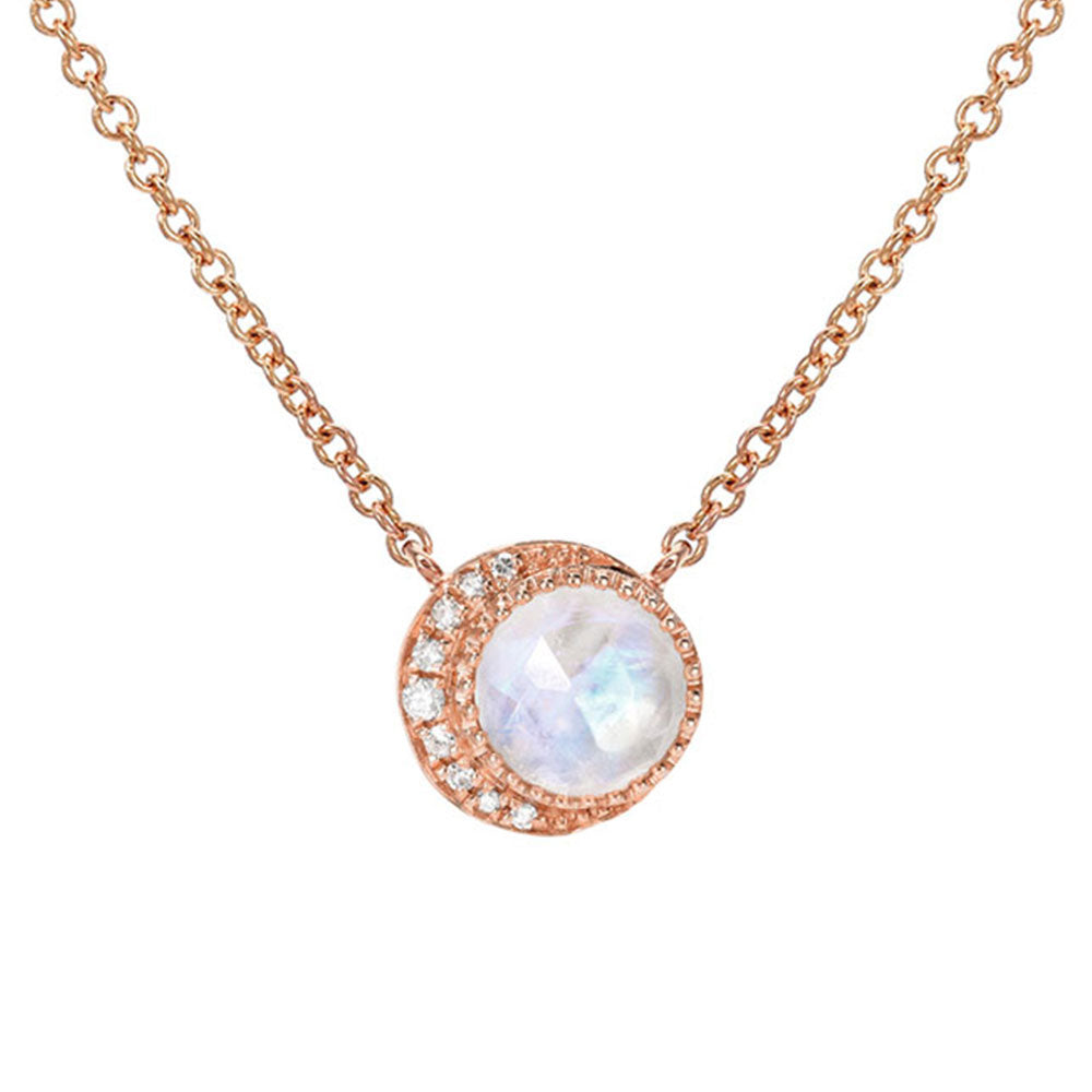 This rainbow moonstone and diamond necklace showcases a perfect combination of expert detailing and lustrous design. Here are a few of our favorite features of the moon phase rainbow moonstone necklace: