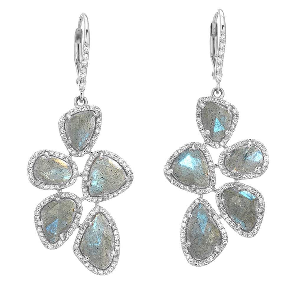 These beautiful dangle earrings feature rose cut labradorites haloed with diamonds set in 14k gold. This organic cluster style is flattering to any face shape, easy to wear, and stunning when your hair is worn up or down!