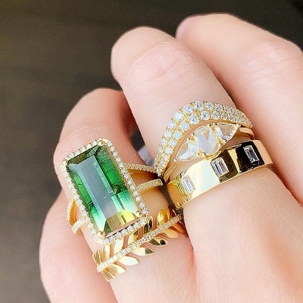 This beautiful tourmaline features distinct bands of color, and is set on a solid 14k yellow gold band, with a halo of diamonds.