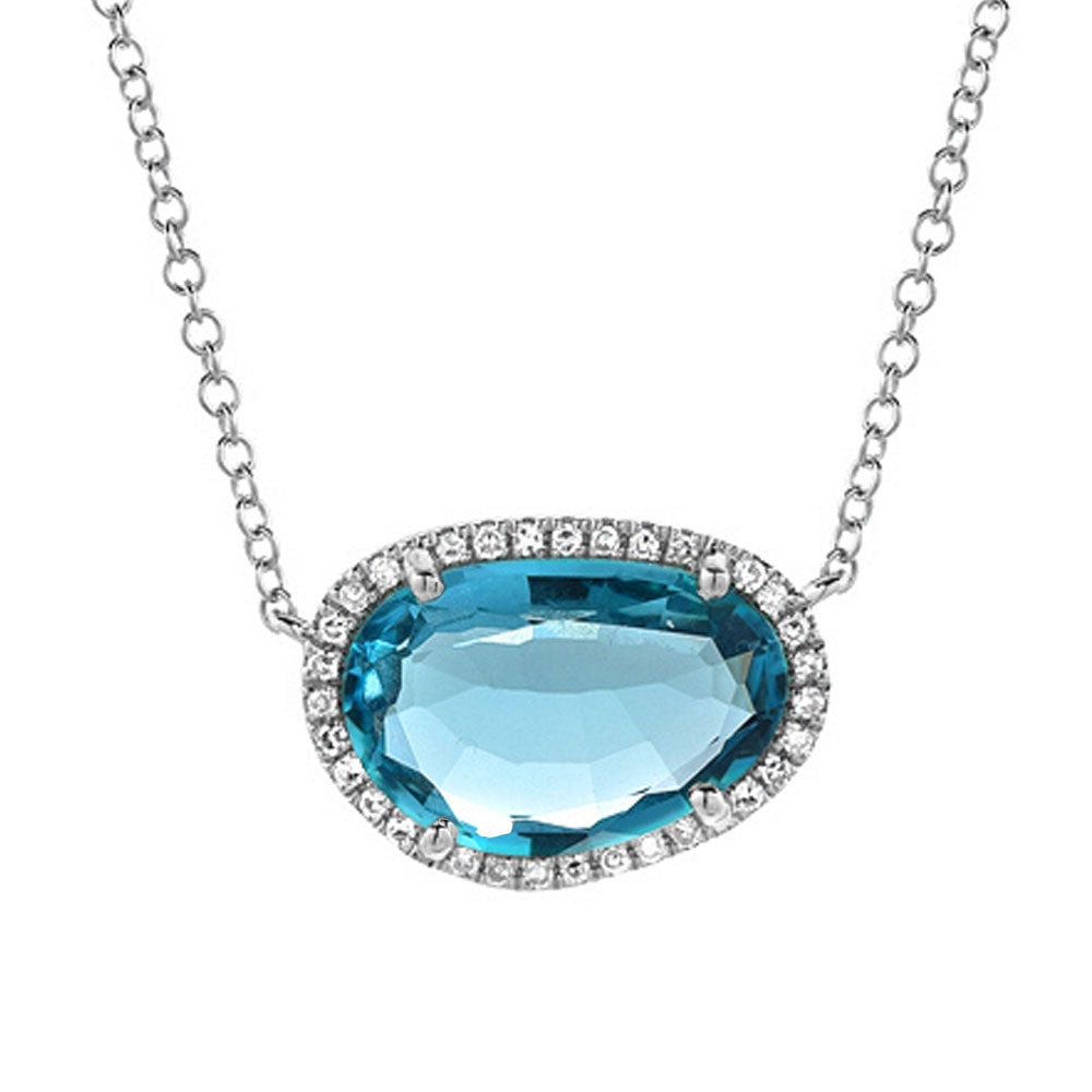 This 14k gold necklace features an organic shaped London blue topaz with a diamond halo, on a 16-18" adjustable chain. The flat face of this stone allows a glimpse into the heart of the stone; its rich, deep blue color and beautiful hand-cut facets.