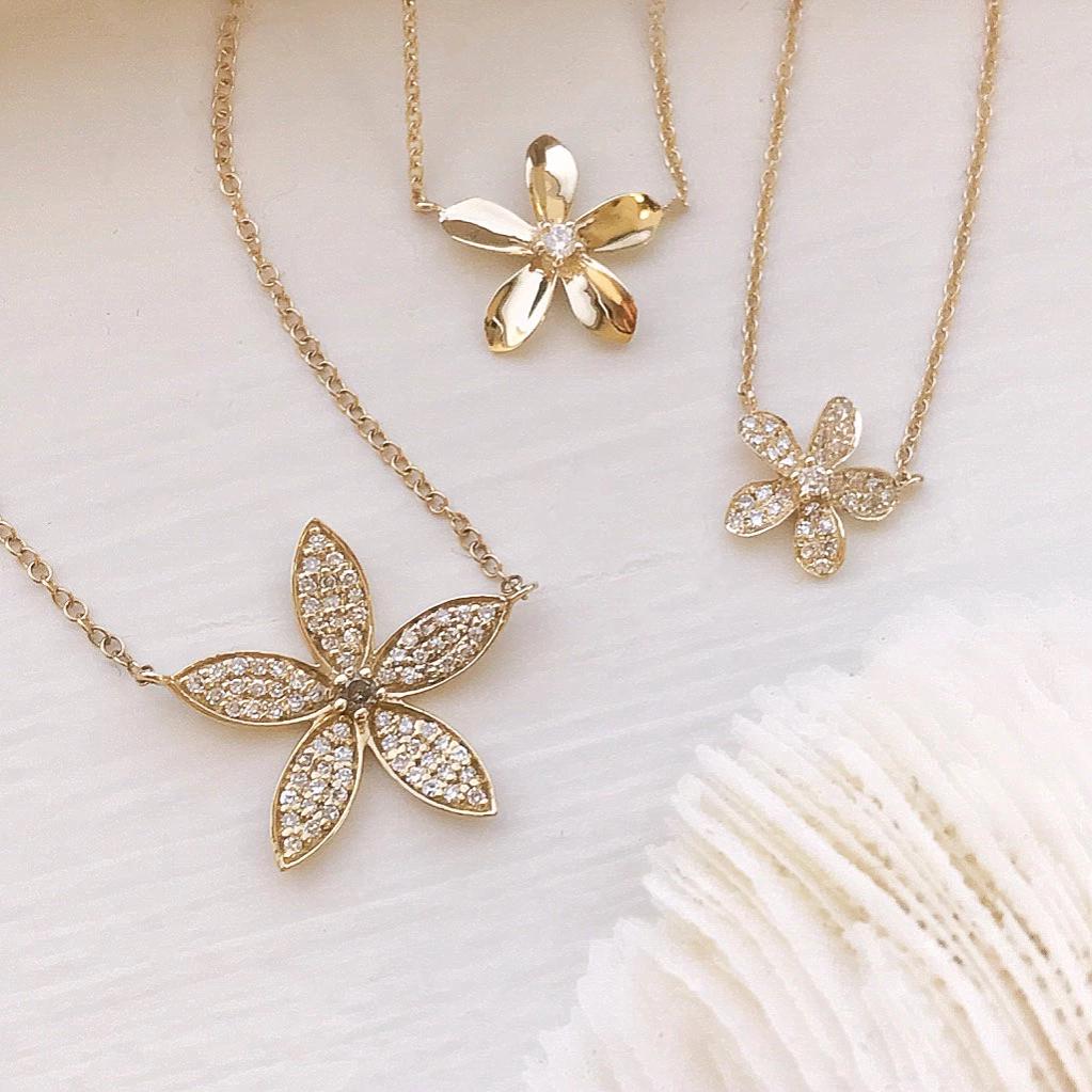 Florals and botanicals are nature’s jewelry. Who can resist the uplifting shape of the plumeria? This flower symbolizes natural beauty, charm, and new beginnings. It can instantly add a hint of feminine appeal to any look. Each plumeria charm is handcrafted in 14k gold and handset with diamonds. Make it your own! This style is available in high polish and diamond-encrusted necklaces of varied sizes, as well as elegant stud earrings.