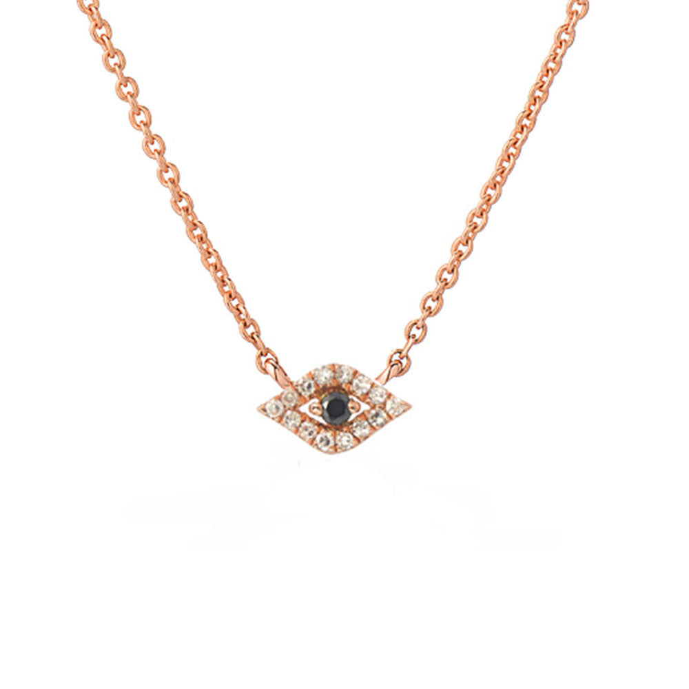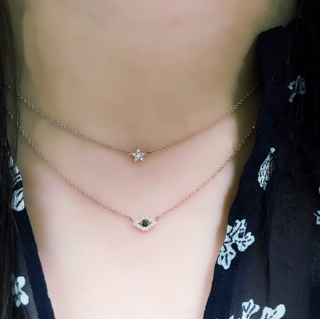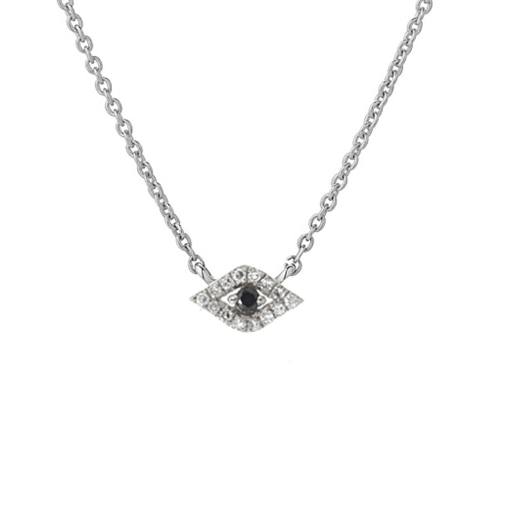 This adorable evil eye necklace in white and black diamonds hangs from a 14-15-16" adjustable chain. Here are a few of the top features:
