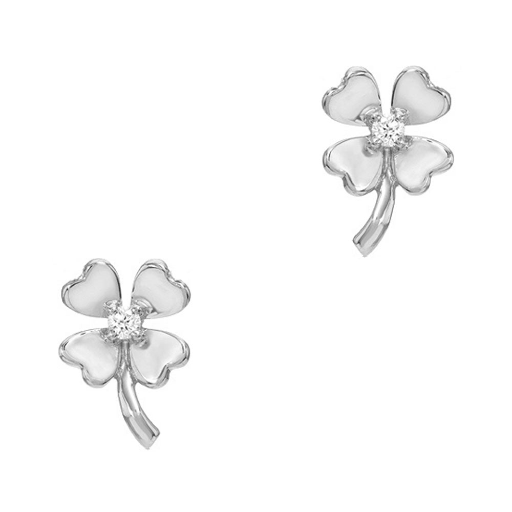 A pair of four leaf clover earrings - what could be luckier? This adorably cute design features high polish 14k gold petals centered around a prong-set diamond center, with post and butterfly backings. A matching necklace is available to order. This little clover measures approximately 9.5mm tall by 6.7mm wide.