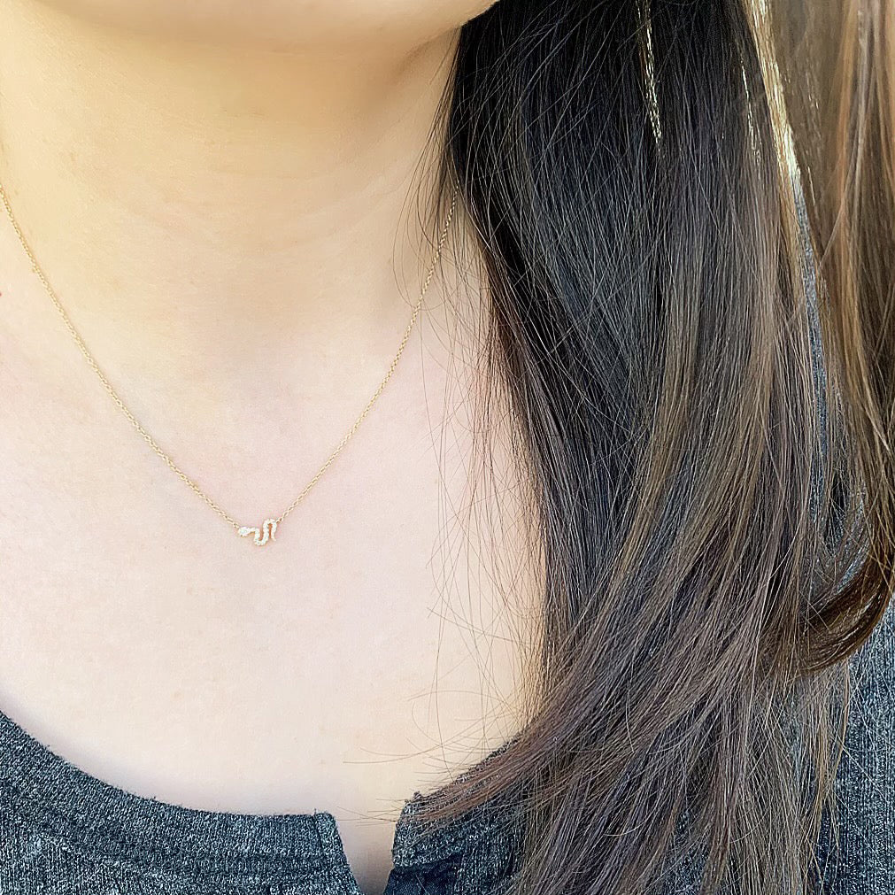This adorable mini snake necklace is set with diamonds, made by hand, and utterly gorgeous. Here are a few of the top features: - Available in rose gold, yellow gold, and white gold