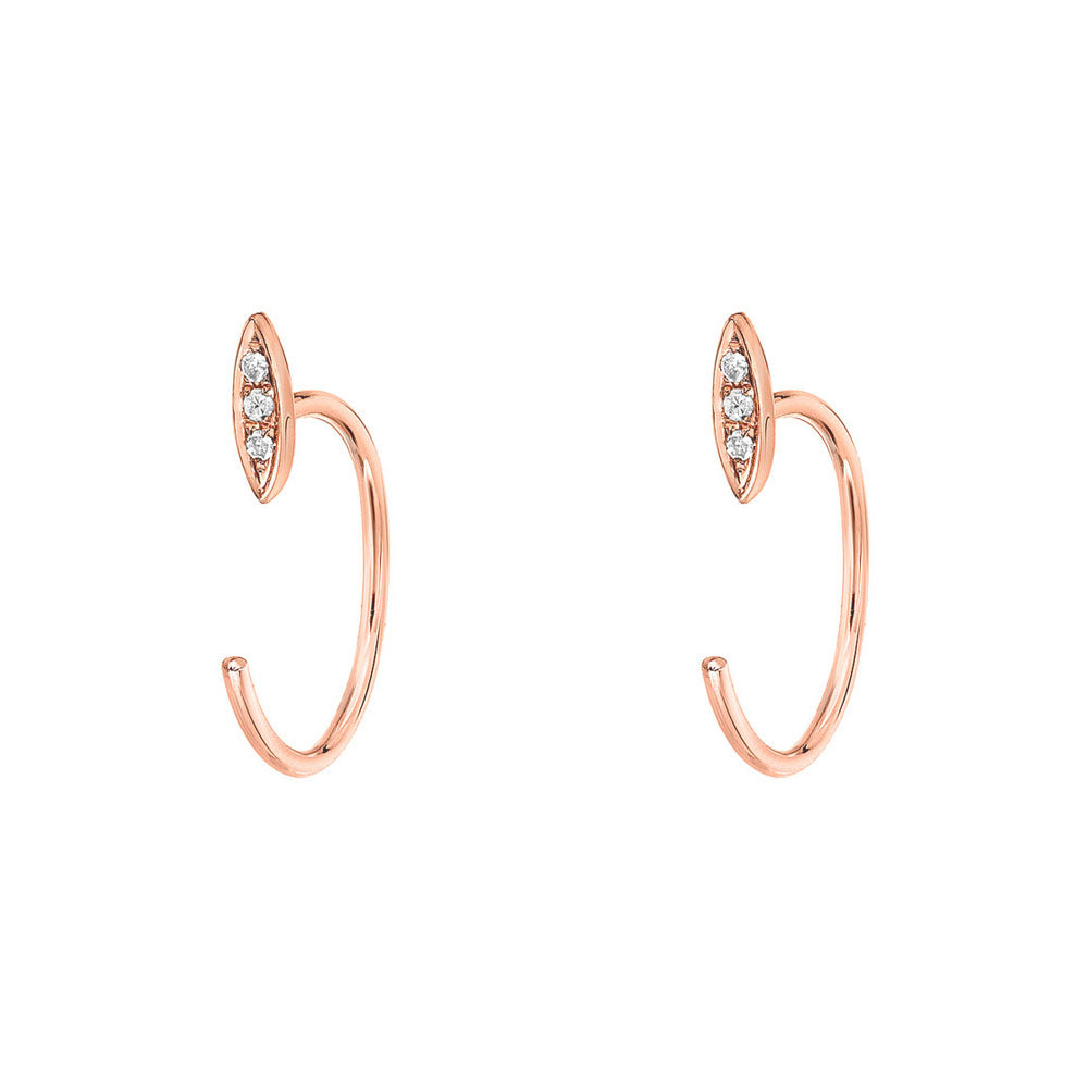 These petite 14k gold earrings feature a willow leaf decorated with diamonds on a three quarter hoop. The perfect pop of style for a cool casual everyday look.