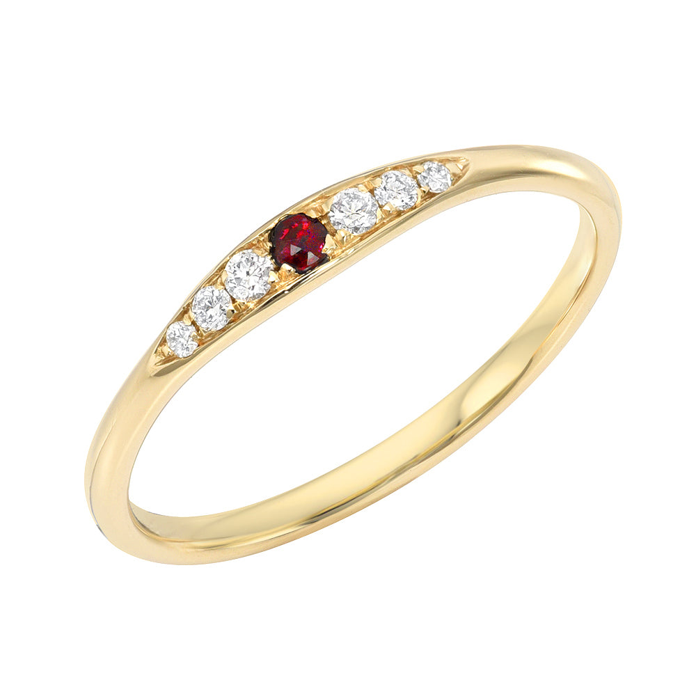 This adorable little ring is a great way to introduce color to your everyday jewelry wardrobe. Its petite dimensions and low profile make it a terrific everyday choice to stack with other bands, or wear alone. A dainty center stone of ruby is flanked on either side by three graduated diamonds, and set in 14k rose, white or yellow gold.