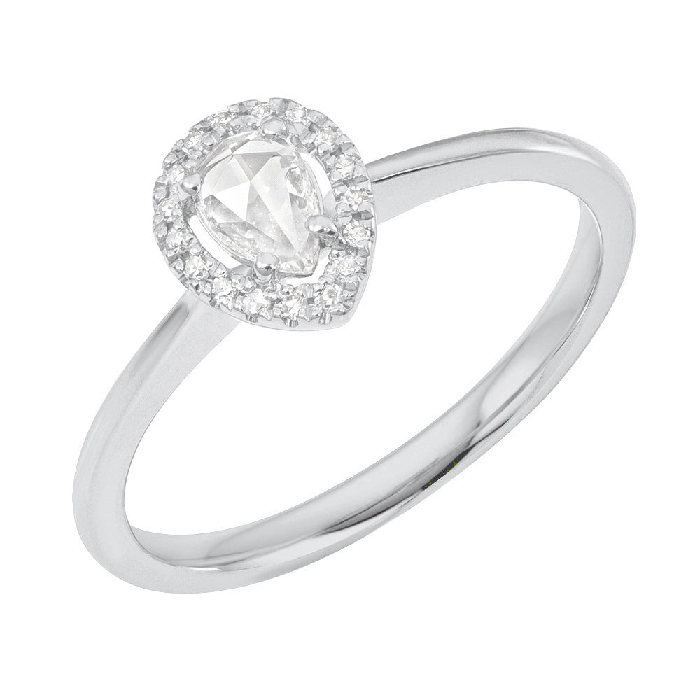 This wonderful simple 14k gold ring features a rose cut pear shape diamond with a dainty halo, mounted on a beautiful polished band. Stackable, this ring is a great choice for alternative bridal. Pear shapes are a traditional bridal choice, representing tears of joy. Make the most of this custom-made stackable setting by adding a skinny band either side, such as the DNA Band or the honeycomb halfway for texture and negative space.