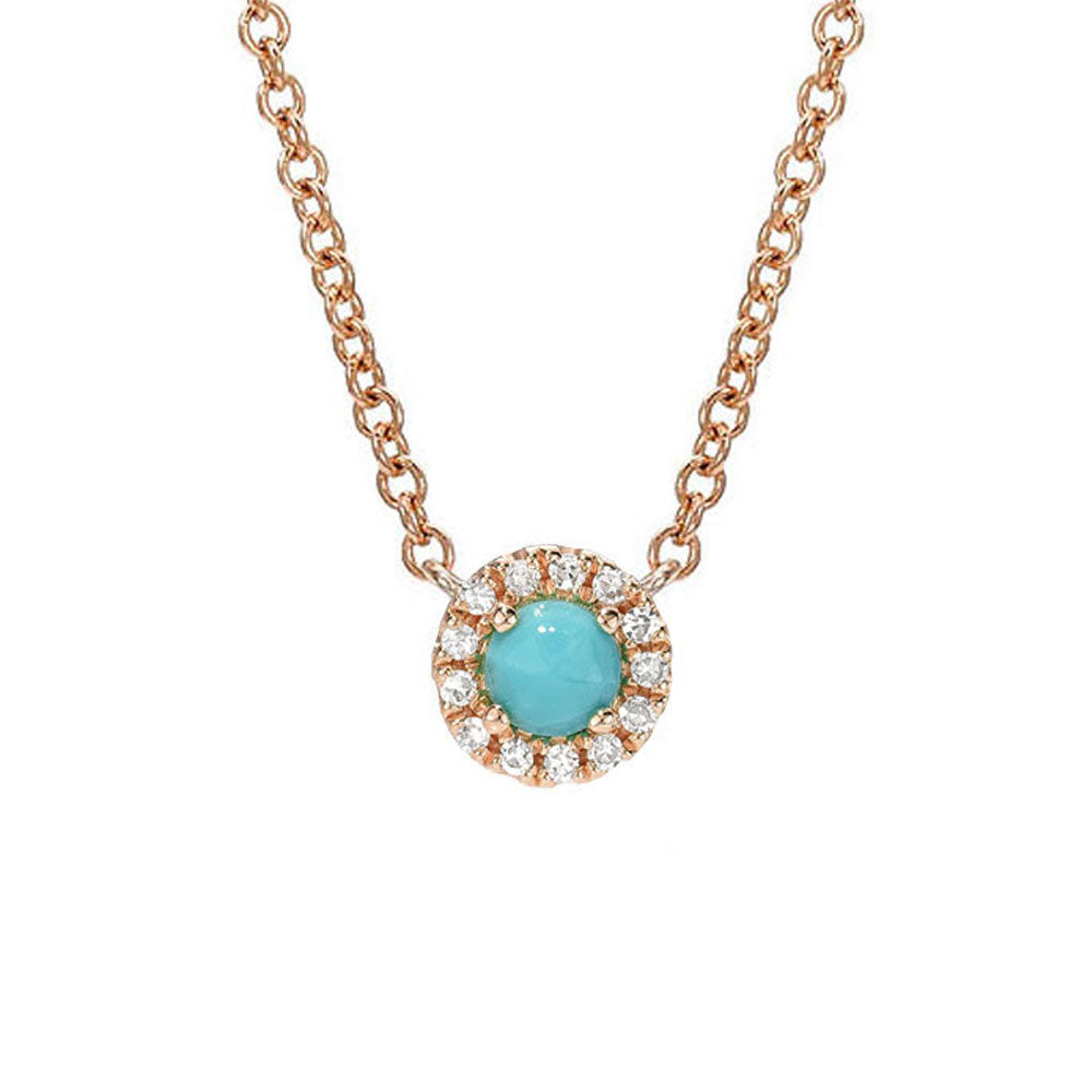 This classic 14k gold necklace features a perfectly petite 3.0mm diameter rose cut turquoise with a diamond halo and is attached to an adjustable 16-18” chain. We love rose cut turquoises - they really bring out the stone's color and shine! Turquoises represent tranquility and growth, and embody truth.