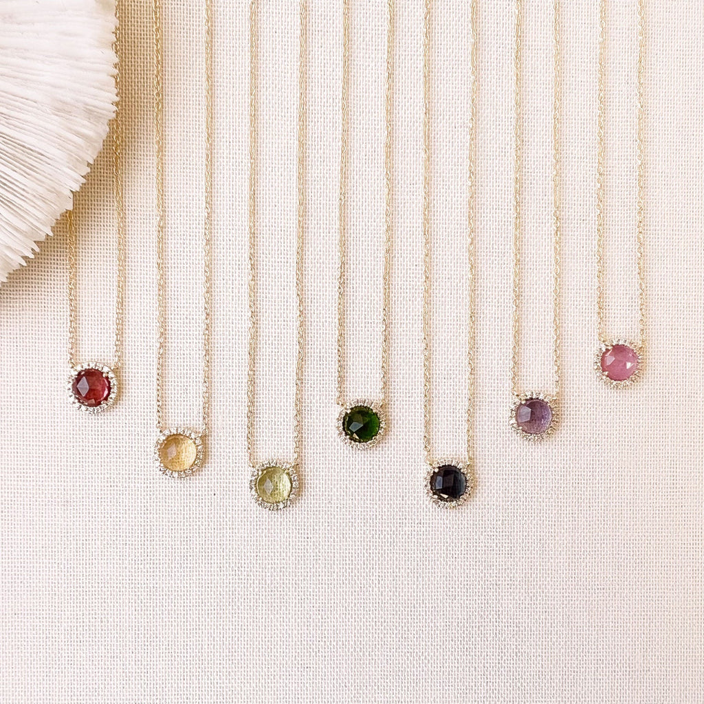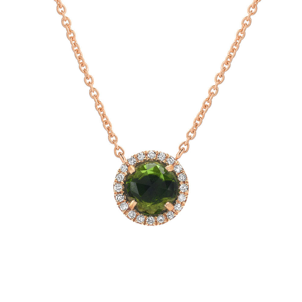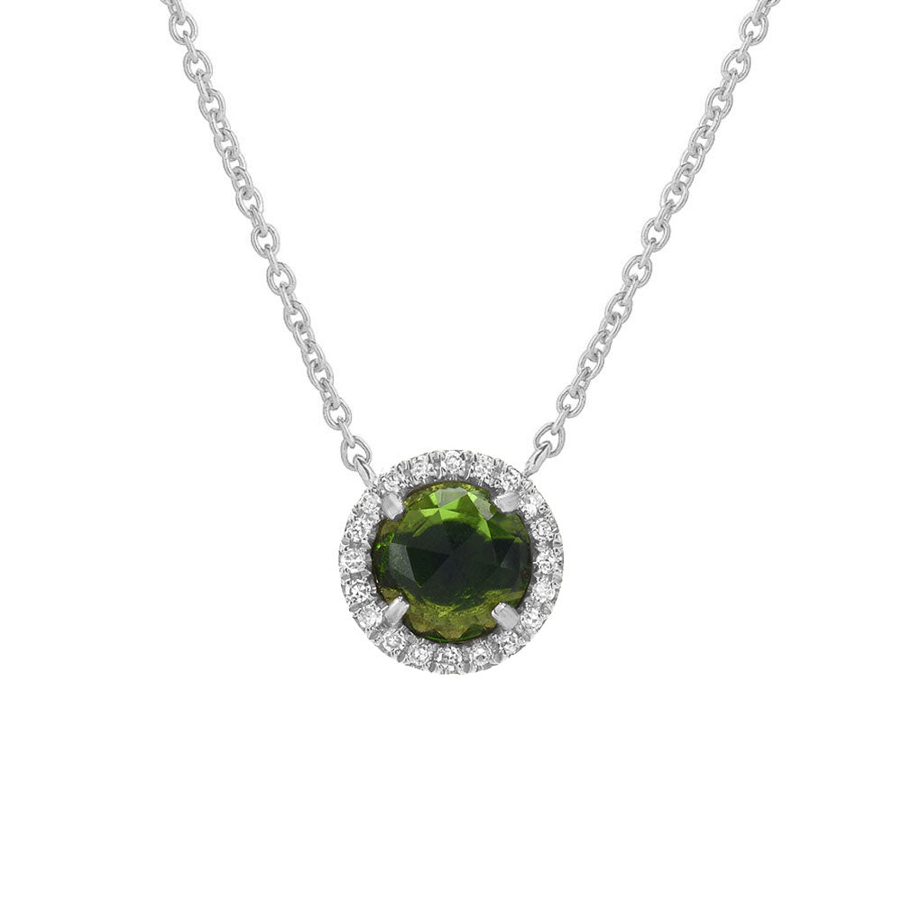 This classic necklace features a 5.0mm diameter rose cut chrome diopside with a diamond halo and is attached to an adjustable 16-18” chain. Each chrome diopside is different - rose cutting allows the best features of the stone to shine. Chrome diposide is said to help the wearer with mental clarity and self-confidence, making this an excellent gift for a student. Handmade from solid 14k gold and all-natural, conflict free diamonds and gemstones.