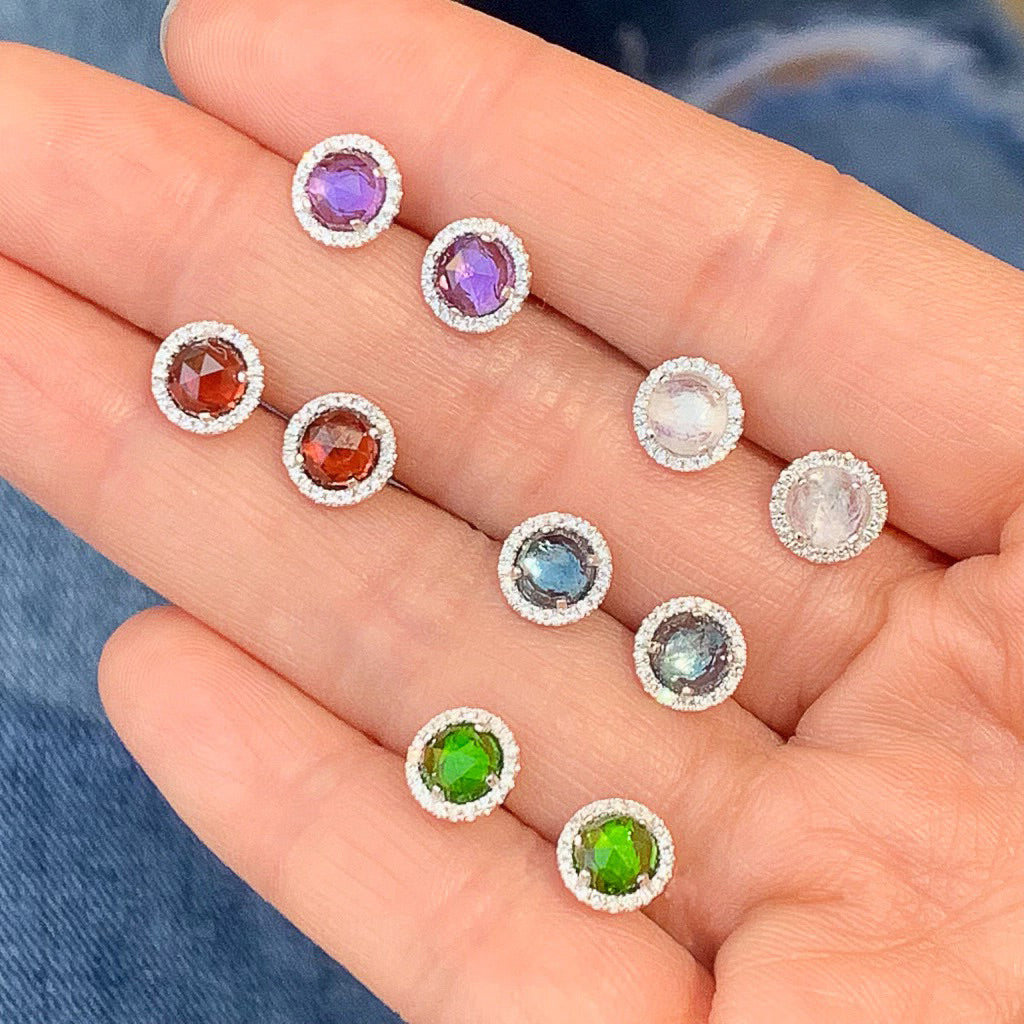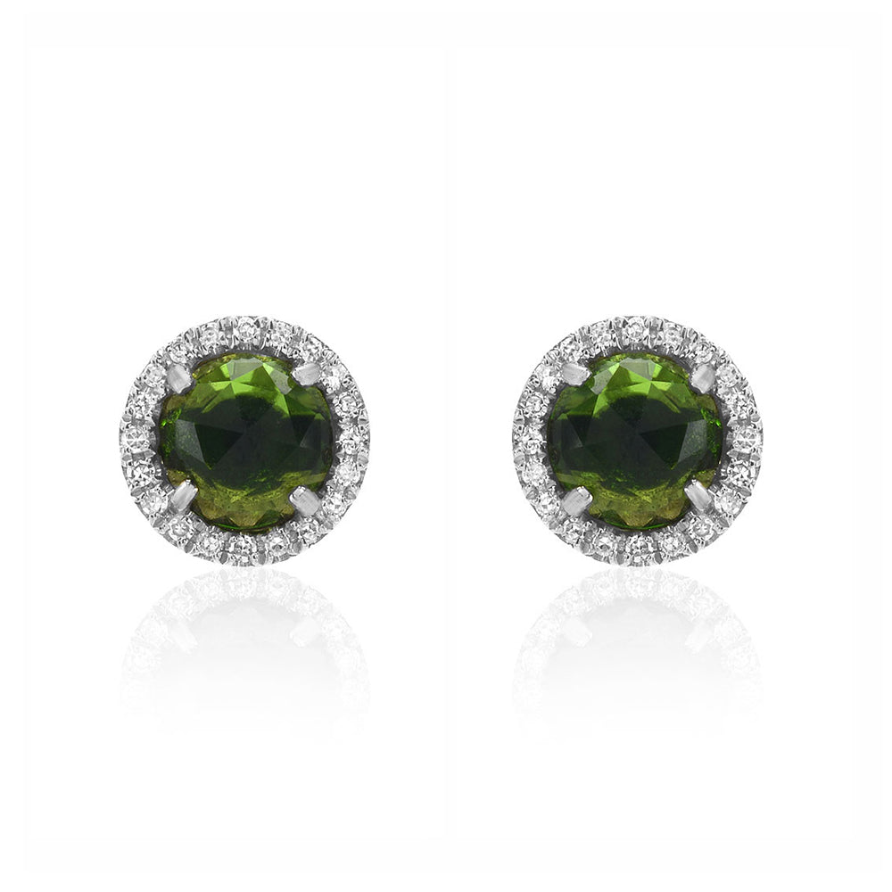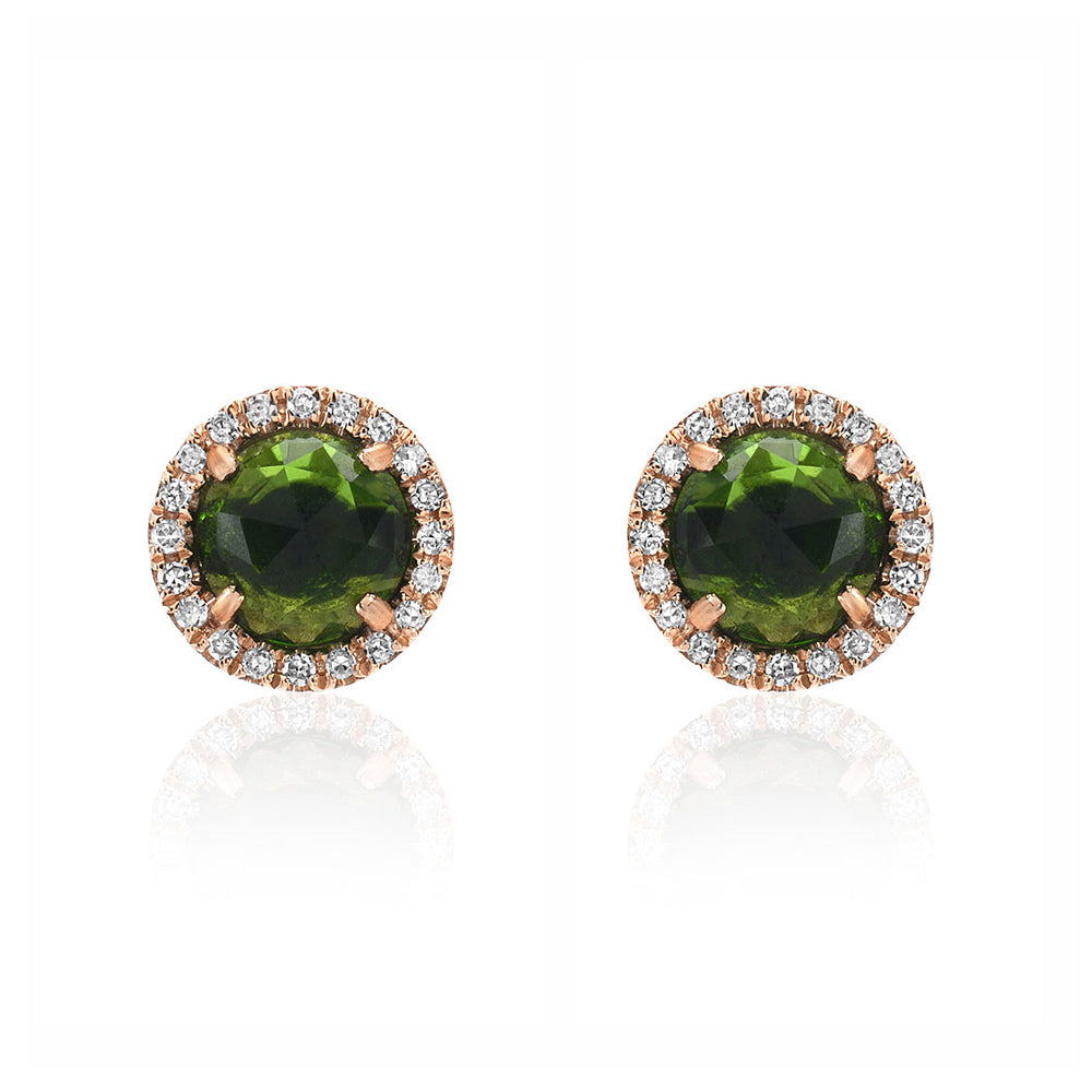 5.0mm stud earrings in 14k gold with a rose cut chrome diopside center and a halo of diamonds on each stud.