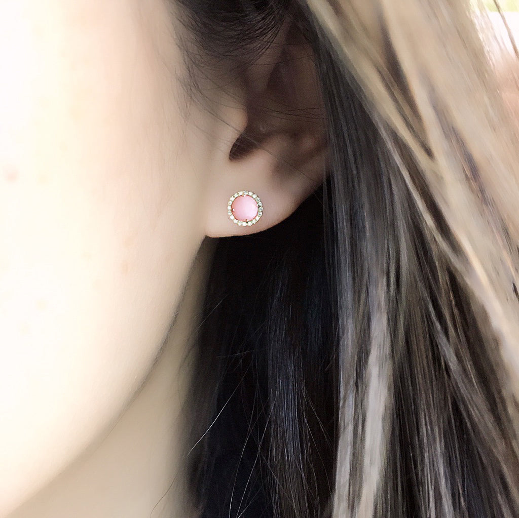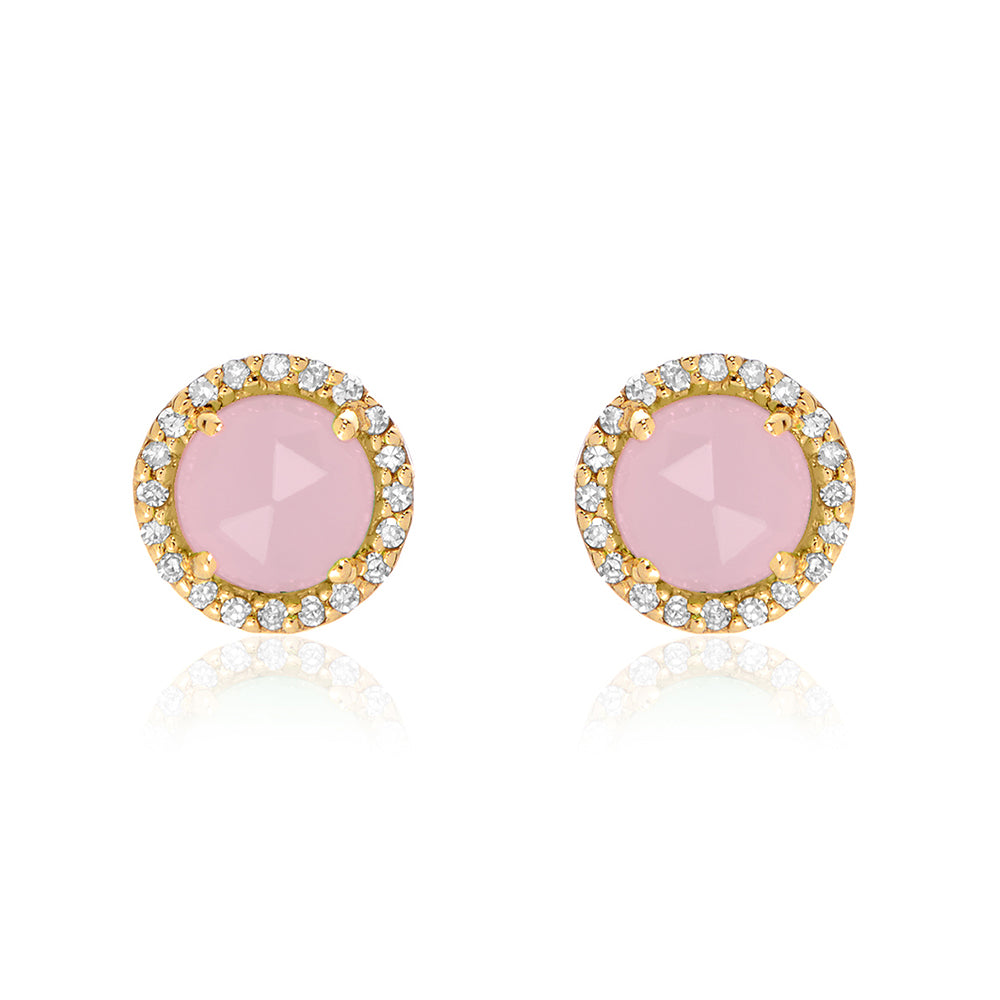 5.0mm stud earrings in 14k gold with a rose cut pink opal center and a halo of diamonds on each stud.