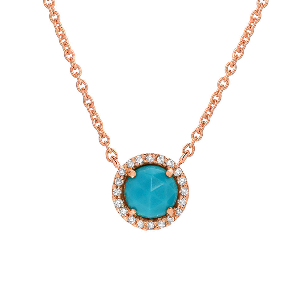 This classic 14k gold necklace features a 5.0mm diameter rose cut stunning turquoise with a diamond halo and is attached to an adjustable 16-18” chain. We love rose cut turquoises - they really bring out the stone's color and shine! Handmade from solid 14k gold and all-natural, conflict free diamonds and gemstones.