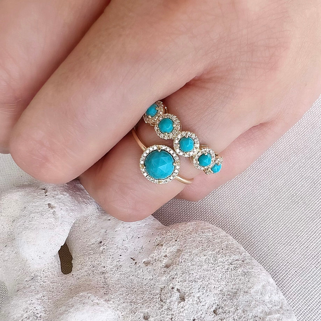 This ring features a 6.0mm rose cut natural turquoise with a diamond halo on a 14k gold comfort band.