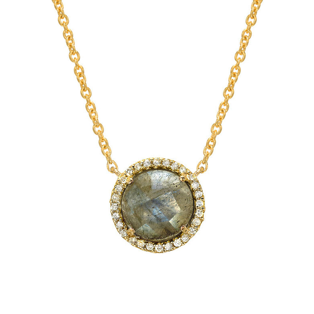 This classic 14k gold necklace features a 7.0mm diameter rose cut labradorite with a diamond halo and is attached to an adjustable 16-18” chain. Rose cut stones feature facets on the front of the stone, which allows the natural beauty of the labradorite to be displayed to its fullest.