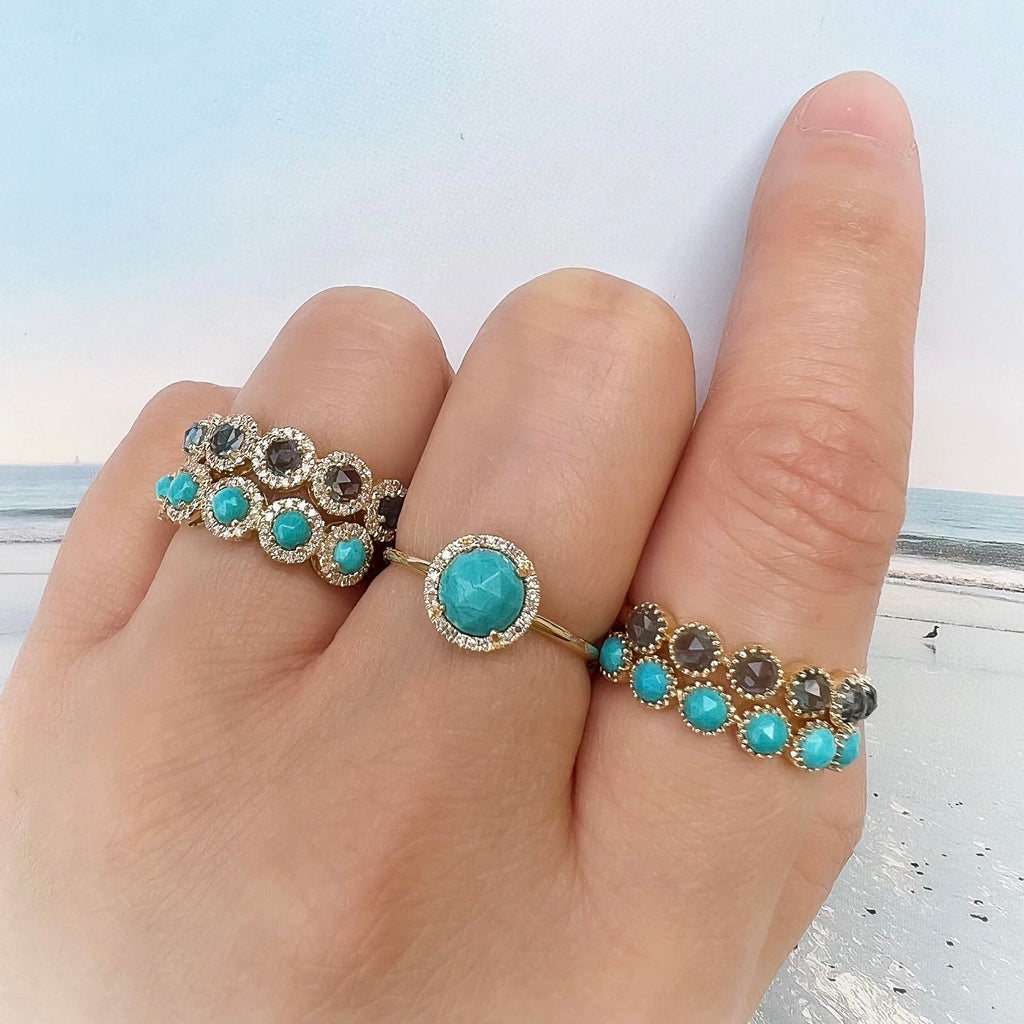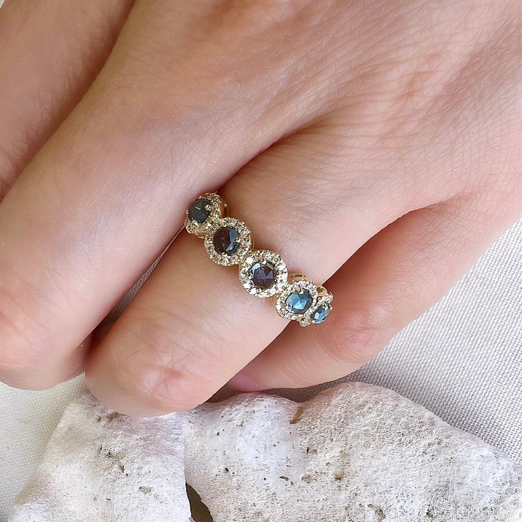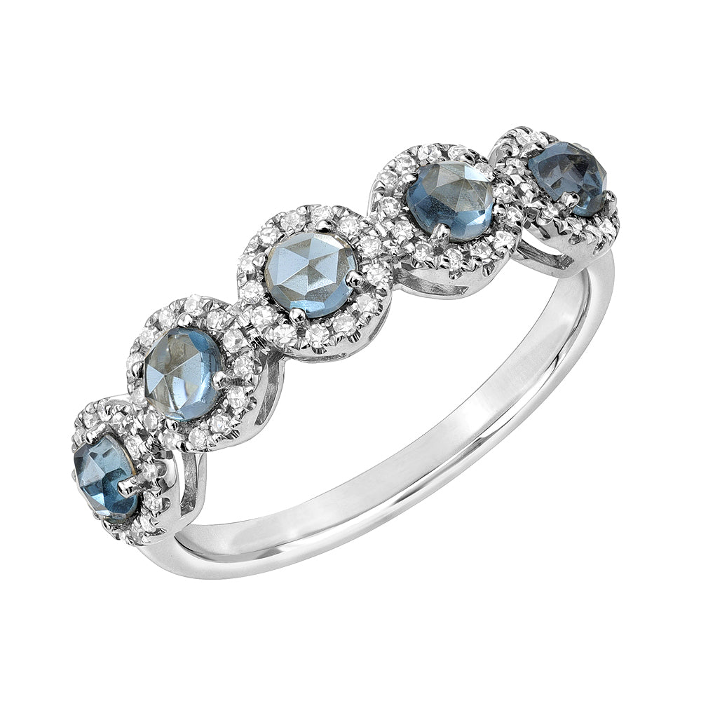 This versatile 14k gold band features 3mm diameter rose cut London blue topazes, each lovingly haloed in 14k gold and diamonds. This is a great ring for stacking, wearing alone for a pop of color, or for an stunning alternative bride.
