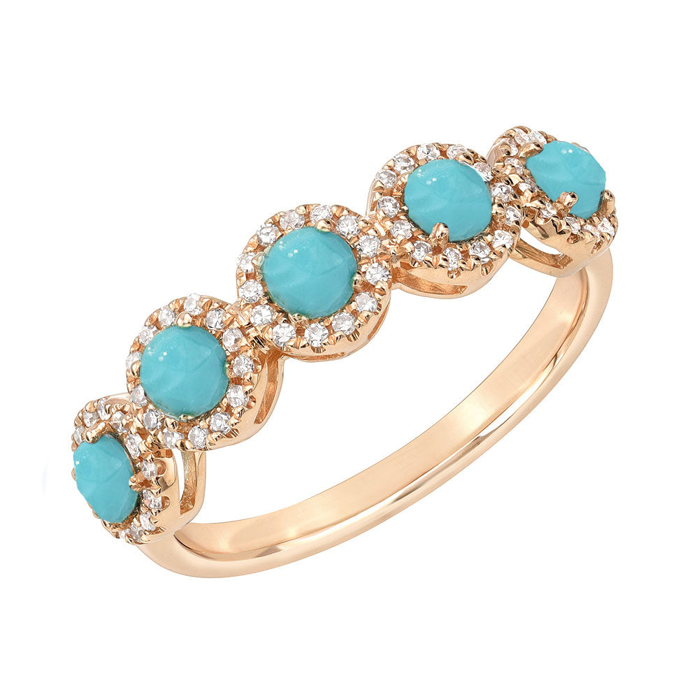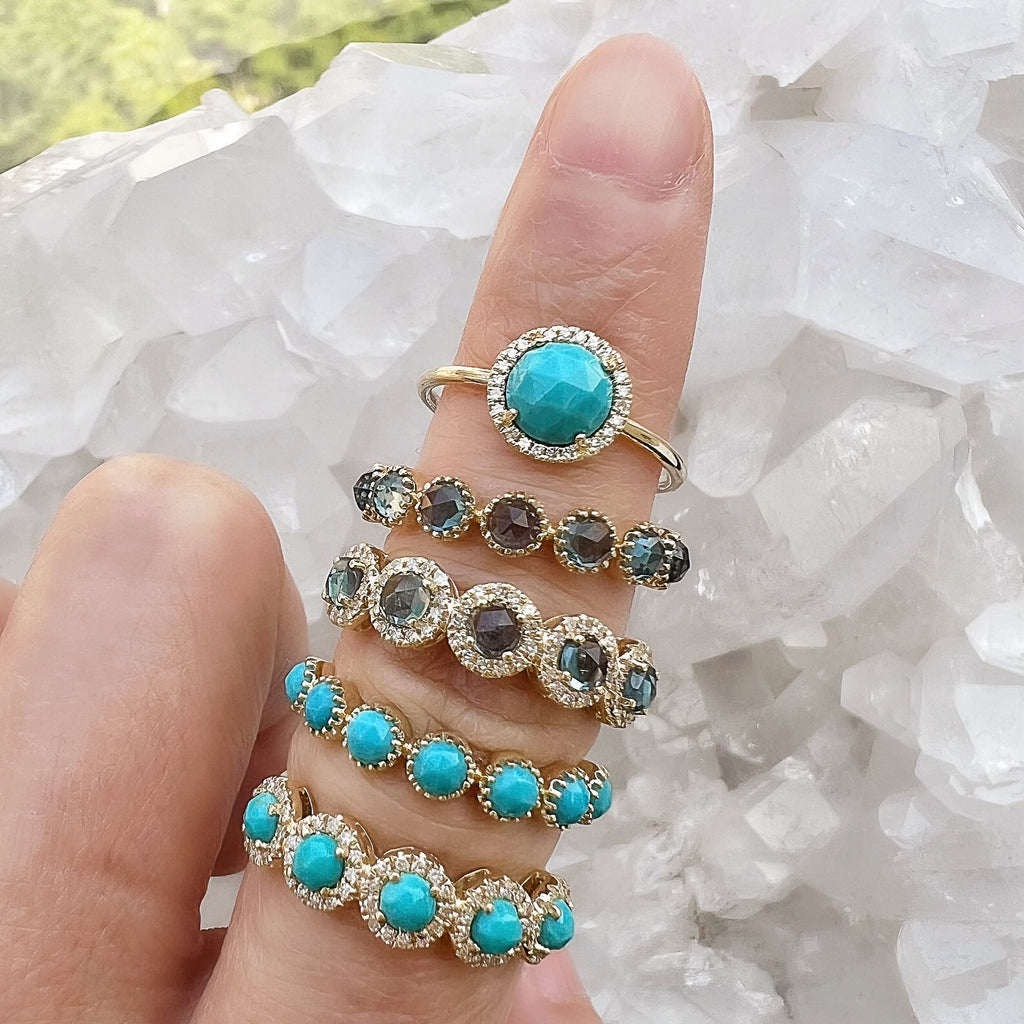 This versatile 14k gold band features 3mm diameter rose cut turquoises, each lovingly haloed in 14k gold and diamonds. This is a great ring for stacking, wearing alone for a pop of color, or for an stunning alternative bride.