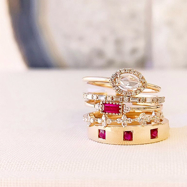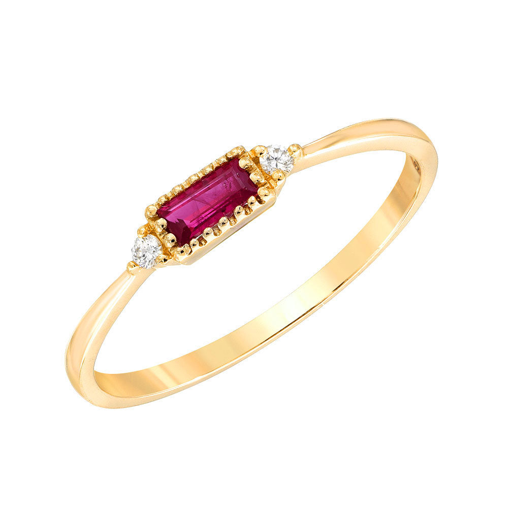 This dainty band features a beautiful, natural baguette cut ruby center, bookended with diamonds and set in 14k gold. A simple, striking ring.