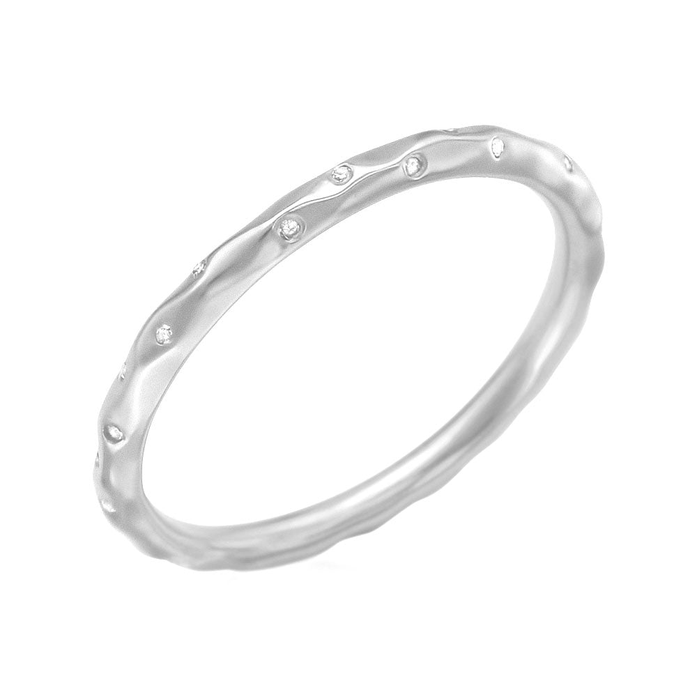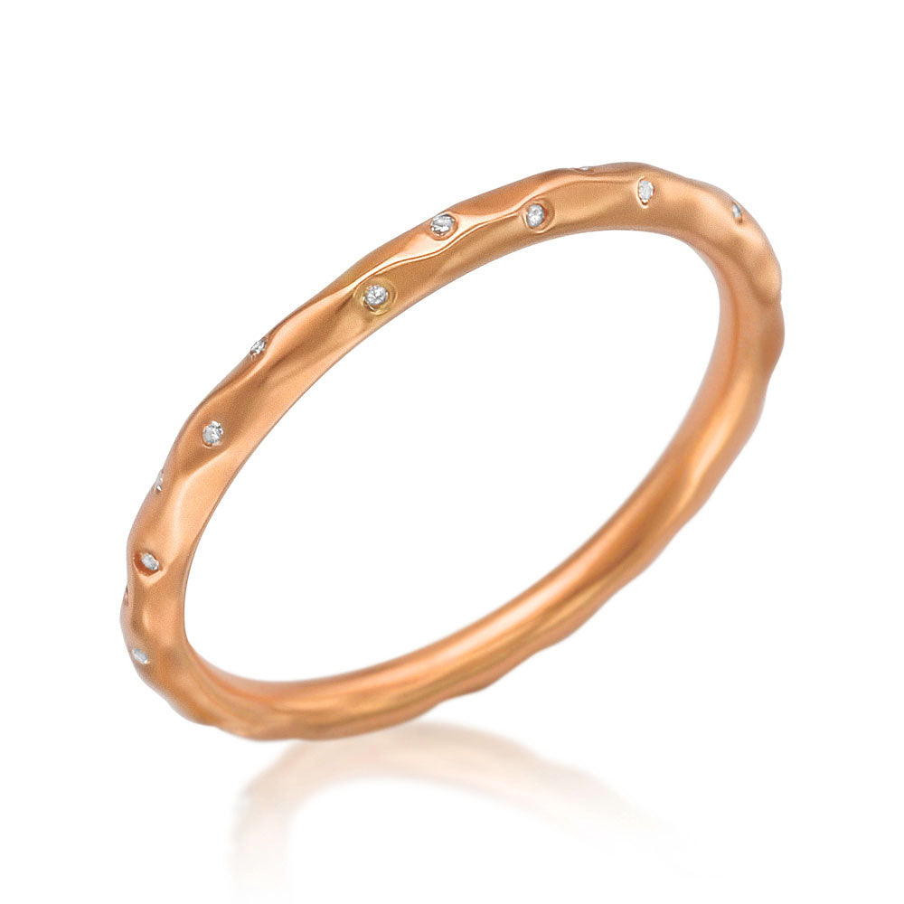 Finely hand-hammered, this stackable band is adorned with 28 diamonds scattered all around the 14k gold. The subtle texture of the rippling gold, peppered with diamonds, is a great addition to any ring stack.