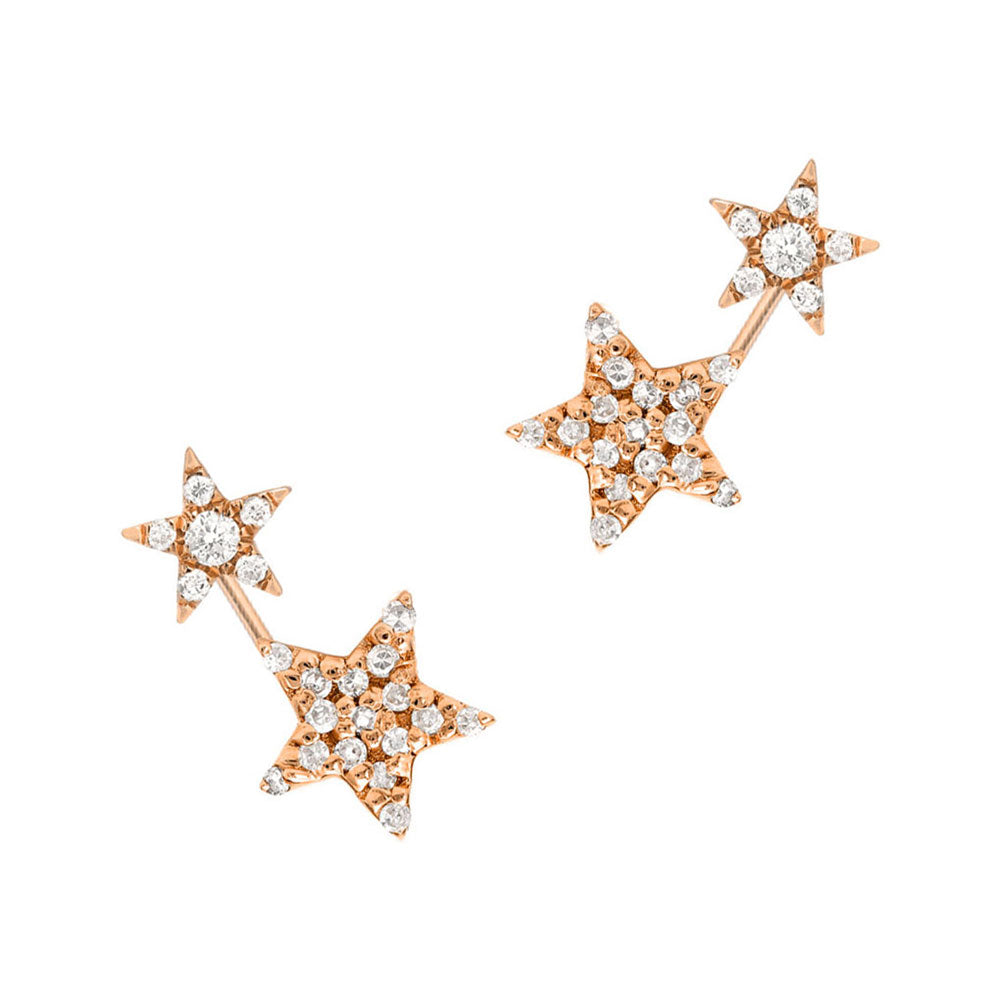 These shooting star earrings are a really fun way to add dimension to your ear. Each pair features ethically-sourced micropave diamonds set in 14k rose, white or yellow gold. Approximate total length of earring: 12.3mm. The stud is positioned in the center of the larger star, so the earring can be worn in a variety of different directions, like a climber.