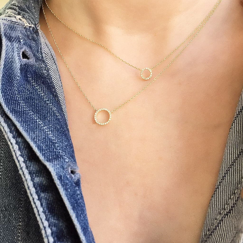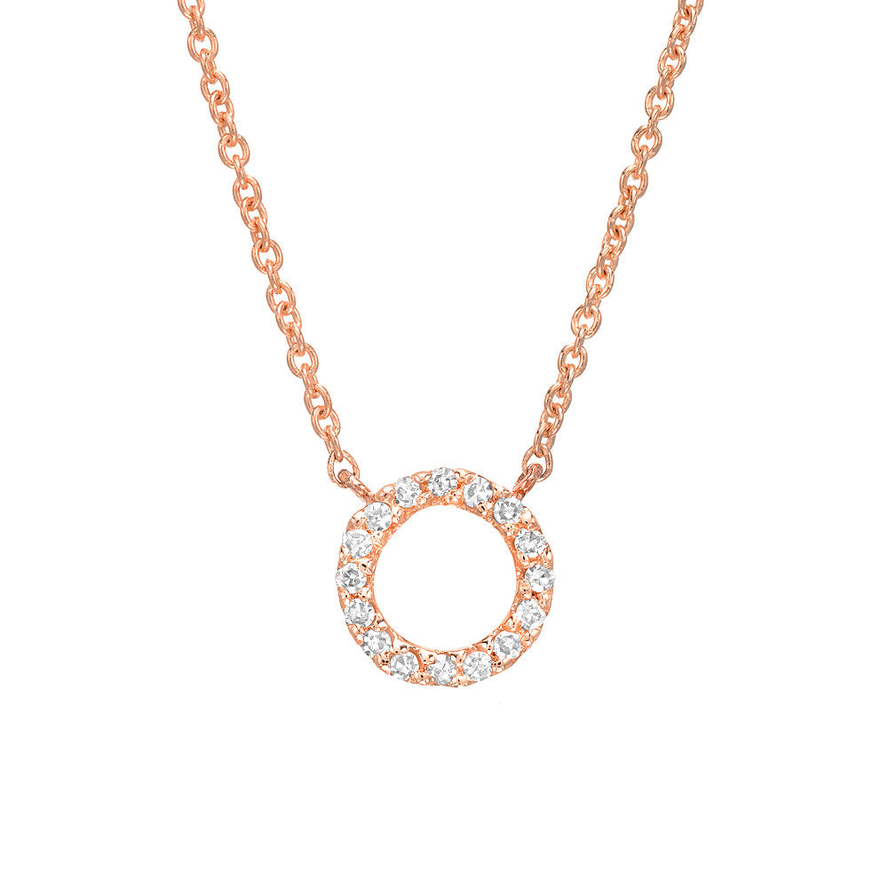 This 14K gold small circle necklace features 16 hand set diamonds, and hangs from a 16-18" adjustable chain. Circles represent endless love, and the circle of life. This petite open circle is cast in 14k rose, white or yellow gold, set with diamonds and attached to a delicate 16-18" adjustable chain.