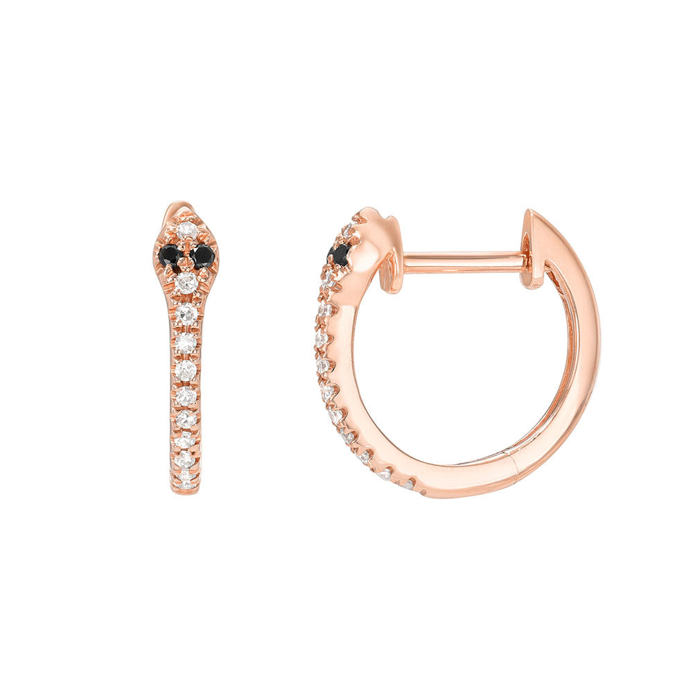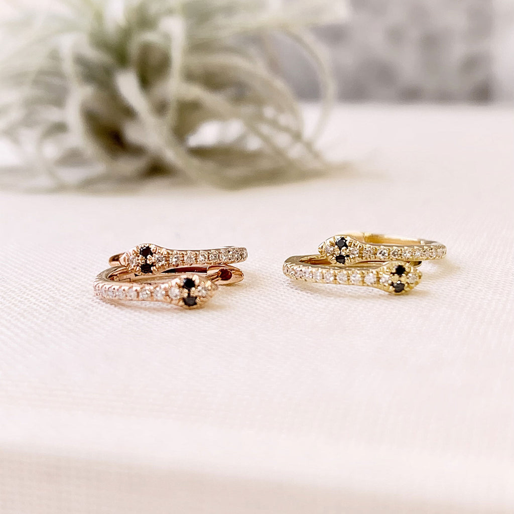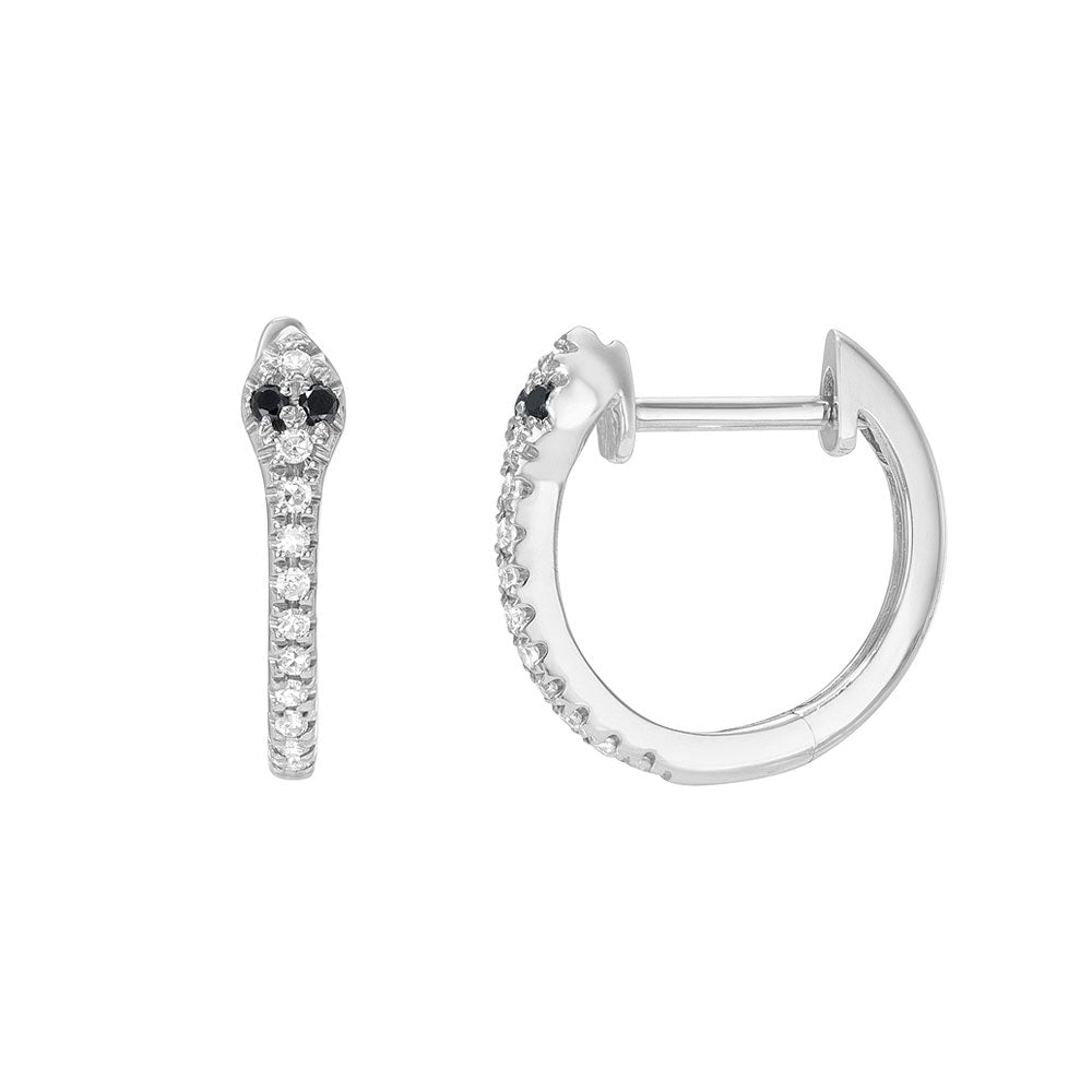Snakes symbolize renewal, rebirth and endurance - these gorgeously quirky huggies are our new favorites! Subtle details in these slender, elegant hoops elevate an everyday style to something really special. white and black diamonds are set in 14k white, yellow or rose gold. Add these earrings to your jewelry wardrobe today!