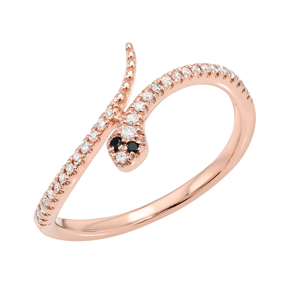 Snakes are a powerful symbol of rebirth, self-reliance and renewal. Show your resilience and power with this adorable petite snake motif halfway diamond ring. This beautifully dainty design features 14k gold with white diamonds and black diamond eyes for a subtle style.