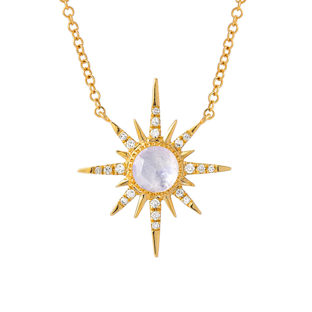 Celebrate the magic of a hand faceted rainbow moonstone with our Starburst Rainbow Moonstone and Diamond Necklace. This celestially inspired necklace features a stunning rose cut moonstone surrounded by a diamond-adorned starburst halo.