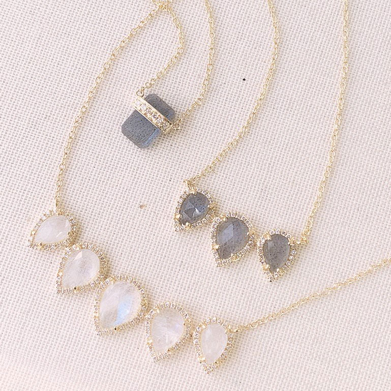 This gorgeous 14k gold necklace showcases pretty rose cut labradorites with diamond haloes on a 16-18" adjustable chain.