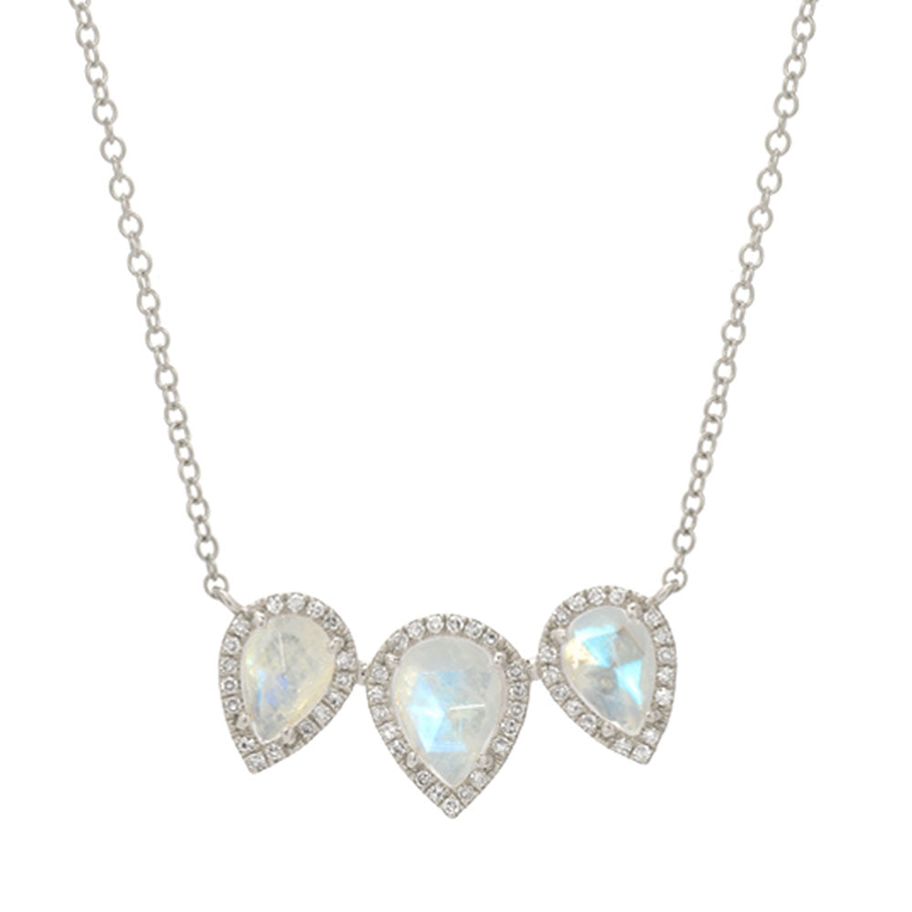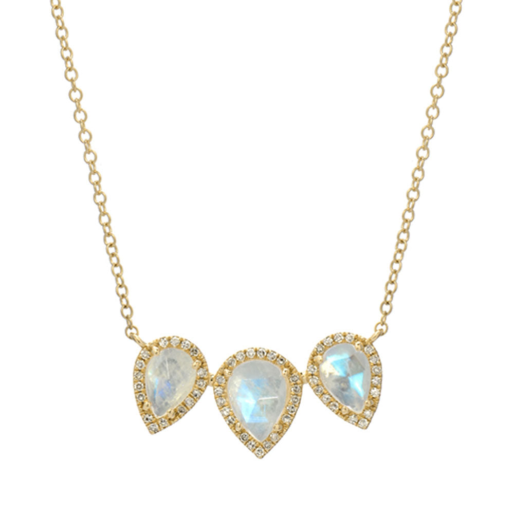 This adorable necklace features three rose-cut teardrop shape rainbow moonstones haloed with diamonds and set in 14k gold. Here are a few of the top features: - Available in rose gold, yellow gold, and white gold