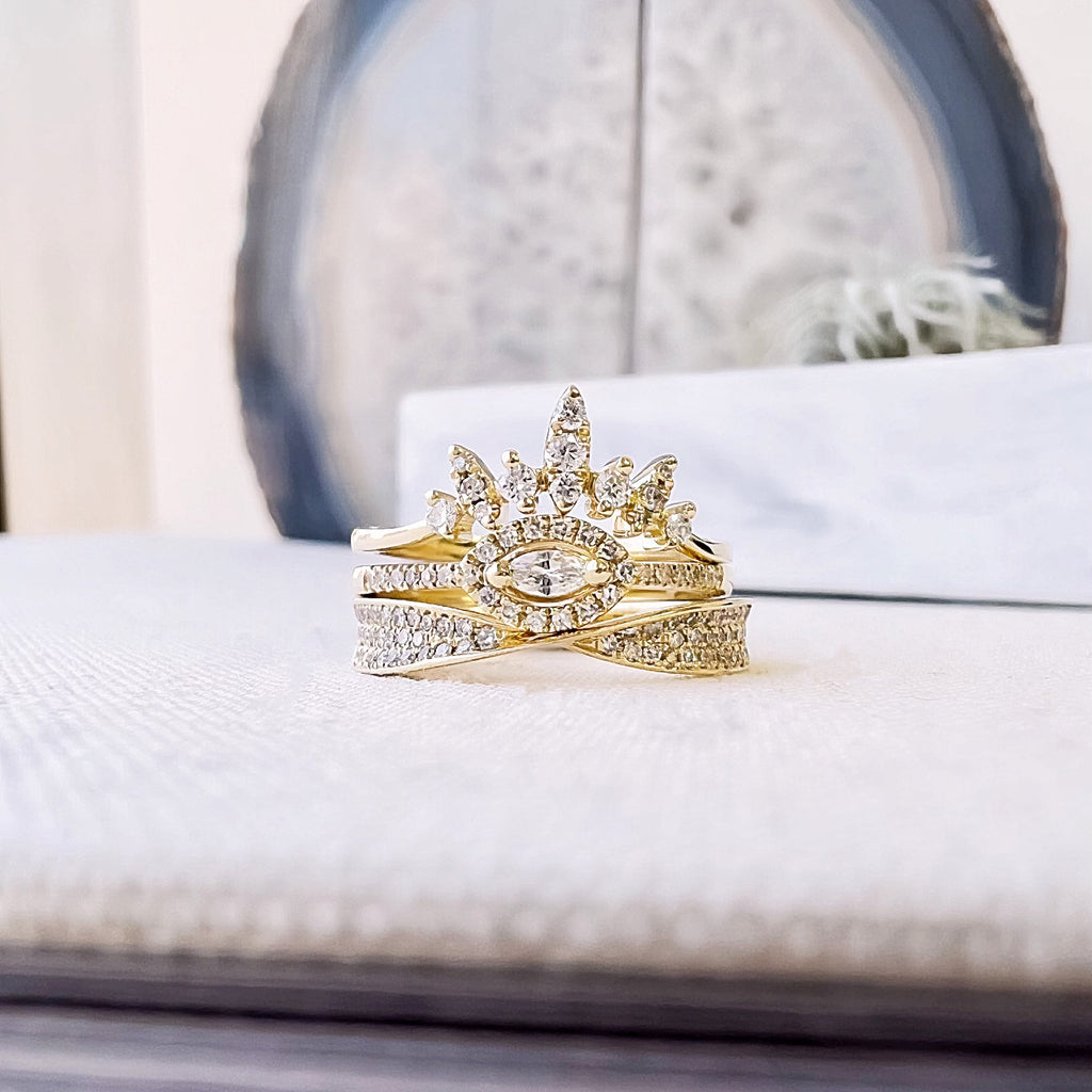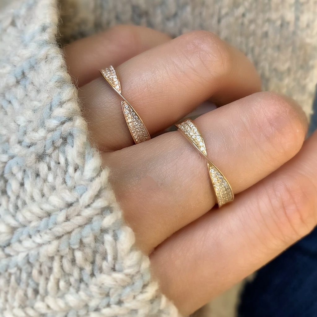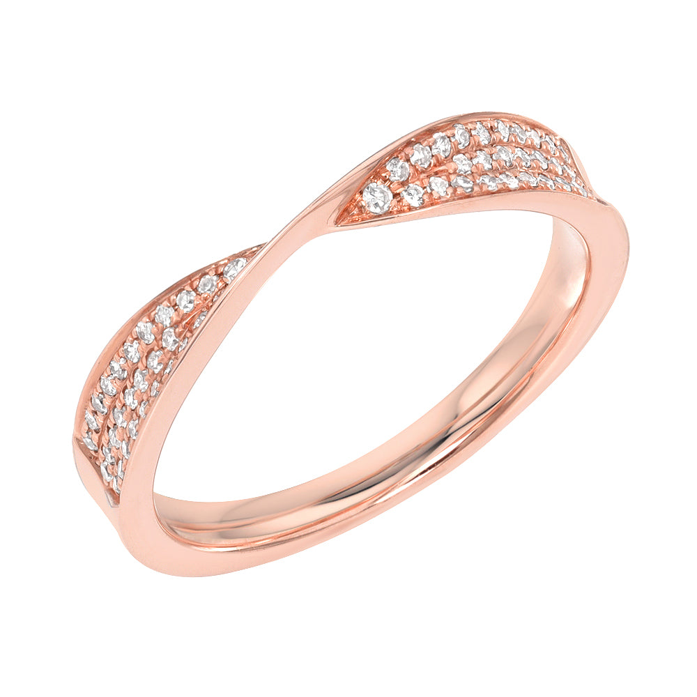 This wonderful 14k gold band offers an elegant twist of gold, embellished with micropave diamonds, perfect for framing a solitaire band or adding negative space to a stack. An ideal wedding band, stacker, or even worn alone for a subtle gleam. The twist shape adds dimension in a style that is both retro and effortlessly modern.